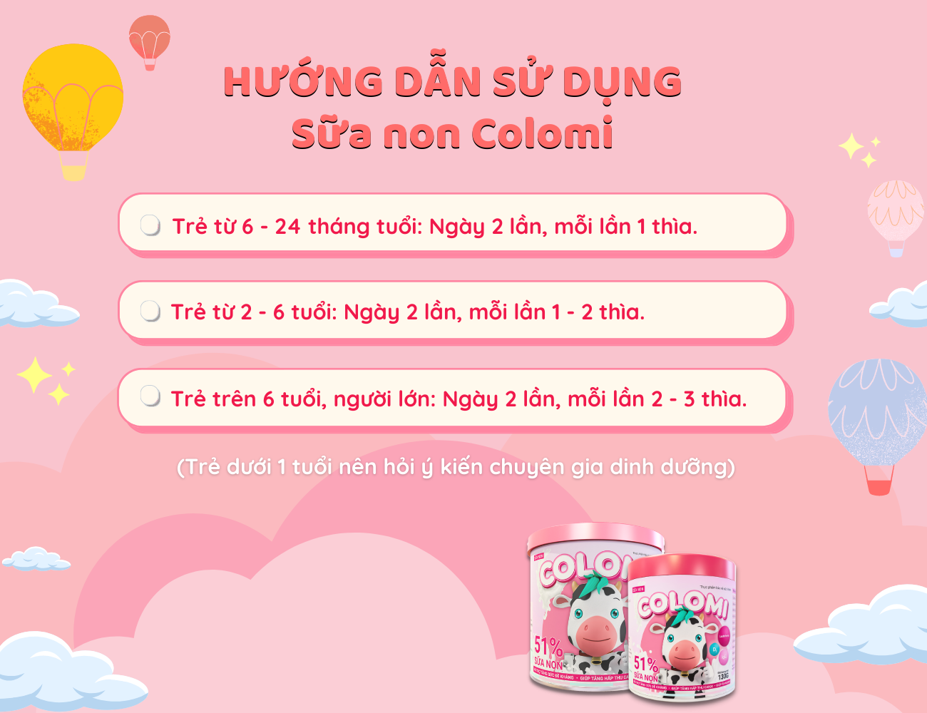 Sữa non cao cấp Colomi tốt cho trẻ cần tăng trưởng toàn diện, trẻ hay ốm vặt, biếng ăn, trẻ sinh non, ít bú mẹ…   3 ĐIỂM NỔI BẬT CỦA SỮA NON CAO CẤP COLOMI   • Sữa non cao cấp Colomi góp phần giúp trẻ tăng sức đề kháng, hạn chế ốm vặt nhờ các kháng thể quý như IgG, IgM, Lactoferrin… • Sữa non cao cấp Colomi góp phần giúp trẻ có hệ tiêu hoá khoẻ mạnh, tăng hấp thu, ăn ngon mỗi ngày nhờ bộ đôi chất xơ FOS và Inulin. • Sữa non cao cấp Colomi bổ sung thành phần Lysine góp phần giúp hấp thu canxi, tạo collagen để giúp quá trình tạo mô liên kết của da, xương, sụn, giúp thúc đẩy và phát triển chiều cao, cân nặng. BÉ KHOẺ - MẸ AN TÂM KHI MUA SỮA NON CAO CẤP COLOMI • Sữa non cao cấp Colomi có nguồn nguyên liệu sữa non được Tập đoàn DETECH nhập khẩu trực tiếp từ Tập đoàn APS Labelle (Mỹ). APS Labelle là tập đoàn hàng đầu về cung cấp nguồn sữa non trên thế giới. • Sữa non cao cấp Colomi được sản xuất theo tiêu chuẩn GMP và được phân phối bởi Tập đoàn DETECH. Tập đoàn DETECH thành lập 1991 (30 năm) với bề dày về nhập khẩu, sản xuất và thương mại. • Sữa non cao cấp Colomi lưu hành tại thị trường Việt Nam được cấp phép bởi Bộ Y tế. • Đội ngũ chuyên gia, đội ngũ tư vấn chuyên nghiệp luôn đồng hành vì sự phát triển của bé yêu của bạn.   MỖI THÁNG BÉ DÙNG BAO NHIÊU SỮA NON COLOMI?   Sữa non cao cấp Colomi là thực phẩm bổ sung, do vậy căn cứ vào liều lượng sử dụng, tuỳ theo độ tuổi, trẻ có thể dùng ở định mức tham khảo dưới đây: • Trẻ dưới 2 tuổi: Mỗi tháng dùng khoảng 1 hộp sữa non Colomi loại 130g hoặc 200g • Trẻ 2-6 tuổi: Mỗi tháng dùng khoảng 1 hộp sữa non Colomi loại 350g (Xem chi tiết hướng dẫn sử dụng trên nhãn sản phẩm)