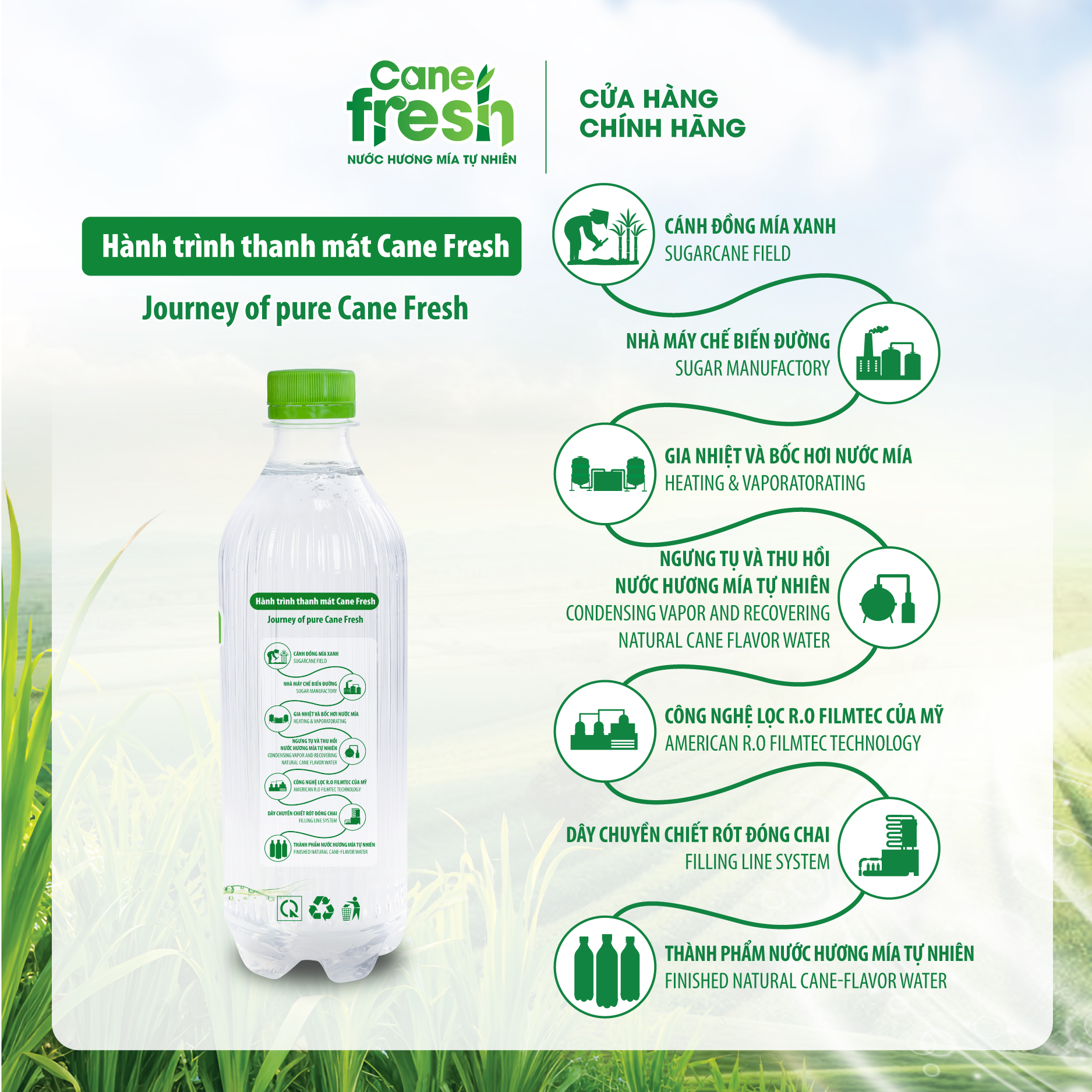 Được sinh ra từ những cây mía thuần khiết được chăm chút cẩn thận, trải qua quá trình sản xuất hiện đại, để ngưng tụ thành dòng nước thanh mát, ngát hương mía tự nhiên của Cane Fresh. Sở hữu độ kiềm tối ưu cho sức khỏe, Cane Fresh giúp bạn "khỏe bụng - mát da", giải ttỏa cơn khát và xua tan căng thẳng từ cuộc sống đầy hối hả và hứng khởi từ hương vị. Sử dụng sản phẩm Nước hương mía tự nhiên Cane Fresh hàng ngày, ngoài việc cung cấp nước cho cơ thể, Cane Fresh còn mang lại các lợi ích hỗ trợ khác như: - Hương mía tự nhiên giúp bạn hứng khởi khi bổ sung nước - Nồng độ kiềm tối ưu ph 8.3, hỗ trợ cân bằng axit dư thừa dạ dày giúp cơ thể khỏe mạnh - Chứa khoáng tự nhiên từ cây mía Na,Mg,Na,K - Các ion H hỗ trợ trung hòa bớt các gốc tự do, bảo vệ tế bào cũng như giảm bớt tốc độ lão hóa. Thành phần: 100% Nước ngưng tụ từ quá trình sản xuất mía đường. Nguồn nước được lọc qua hệ thống RO Filmtec của Mỹ để loại bỏ hoàn toàn tạp chất, diệt khuẩn Ozone đèn UV. HDSD: Uống ngay khi mở nắp. Bảo quản nơi sạch sẽ, thoáng mát, tránh ánh nắng mặt trời, mùi mạn và hóa chất. Uống ngon hơn khi ướp lạnh. HSD: 24 tháng từ ngày sản xuất