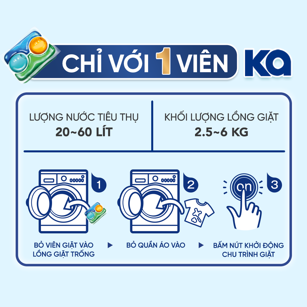 Không còn tình trạng rơi đổ lộn xộn và phải đong đếm bột giặt, việc giặt giũ sẽ tiện lợi hơn với Viên giặt đa năng Ka 4 trong 1. Với công thức siêu đậm