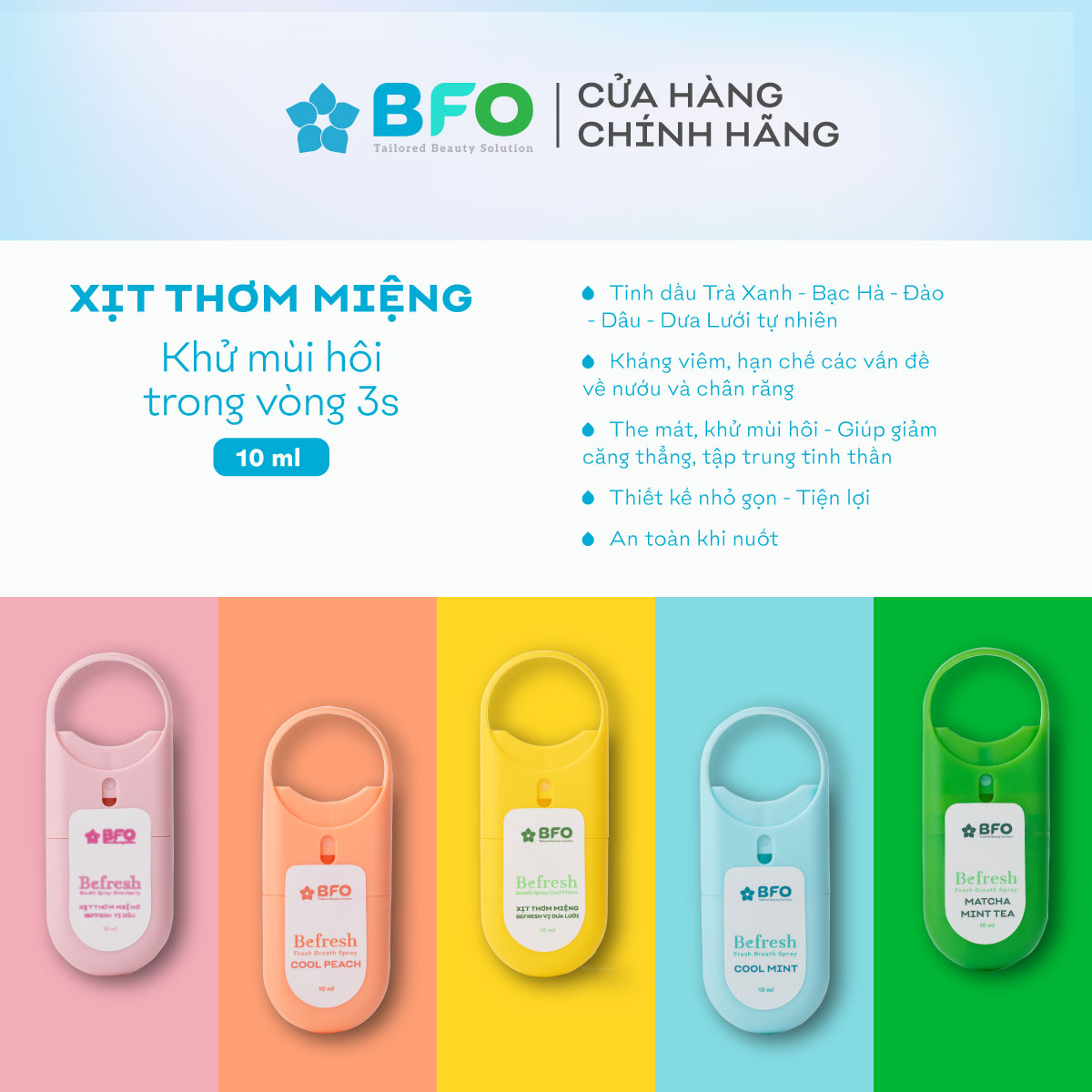 XỊT THƠM MIỆNG BEFRESH TRÀ XANH – BẠC HÀ: BFO là Chuỗi Cửa hàng làm đẹp & chăm sóc sức khỏe với sứ mệnh đem đến những sản phẩm mỹ phẩm lành tính, hài hòa