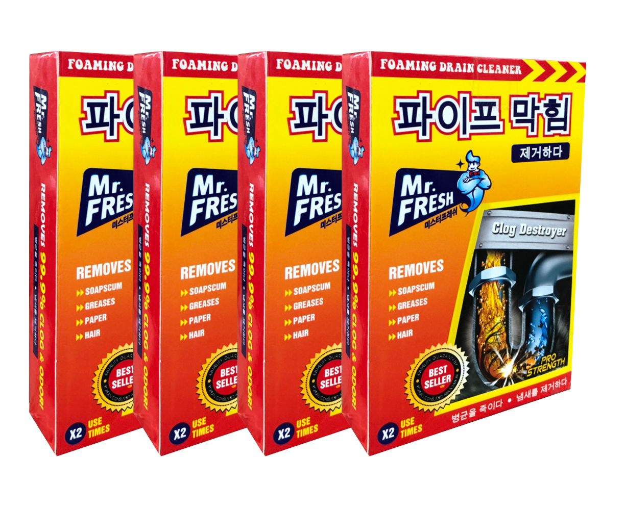 Bột thông tắc đường ống thoát nước Mr.Fresh Hàn Quốc là một trong những sản phẩm tốt nhất được bán chạy ở Hàn Quốc với công thức tiên tiến, các thành phần hóa học chuyên dụng, độ tẩy cực mạnh sẽ xoáy tan mọi cặn bẩn trong đường ống một cách hiệu quả.Sản phẩm sẽ thông sạch mọi loại cặn bẩn như giấy, rác, rau, mỡ, thịt, gạo, tóc… kẹt trong đường ống thoát nước của chậu rửa nhà bếp, lavabo, bồn tắm… mà không làm hư hại đường ống và các thiết bị vệ sinh.Bột thông tắc đường ống thoát nước Mr.Fresh Hàn Quốc trong thành phần của nó luôn có các hỗn hợp hóa học có độ kiềm, độ ăn mòn, độ phân hủy cực cao, giúp phân hủy các hợp chất hữu cơ, chất cặn bã có trong đường ống gây tắc nghẽn.
