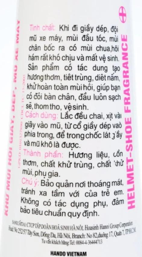 Thông tin sản phẩm Hướng dẫn sử dụng : Xịt vào giày, dép, mũ xe máy trước khi sử dụng Hướng dẫn bảo quản : Bảo quản nơi khô mát, tránh ánh nắng Thành phần
