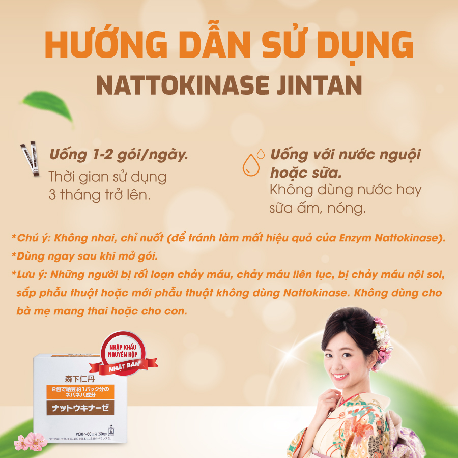 Mua tại TiktokCombo 3 hộp - Nattokinase Jintan Nhật Bản – Hộp 60 gói – Hỗ trợ giảm mỡ máu, ngừa tai biến, tốt cho tim mạch Hỗ trợ phòng ngừa tai biến, mỡ máu - Lẻ 3 Gói NATTOKINASE Jintan Nhật Bản (không có hộp) 1.Thành phần (Cho 2 gói dạng hạt): Bột chiết xuất nuôi cấy bởi vi khuẩn Natto (đậu nành lên men): 100mg (chứa natokinase 2.000FU). Phụ liệu: Dầu thực vật, dầu lòng đỏ trứng, tinh bột biến tính, chất tạo ngọt Sorbitol, chất làm đặc Polysacccharide, chất chống đông vón Sillicon Dioxide, chất điều chỉnh pH, Kali Clorid, Canxi Clorid. 2.Công dụng:
