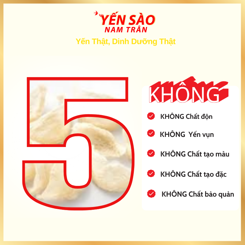 - Sợi Yến to và giòn. Nhược điểm: giá thành cao so với các sản phẩm khác có hàm lượng % yến ít. Hạn sử dụng chỉ 12 tháng do KHÔNG có:
