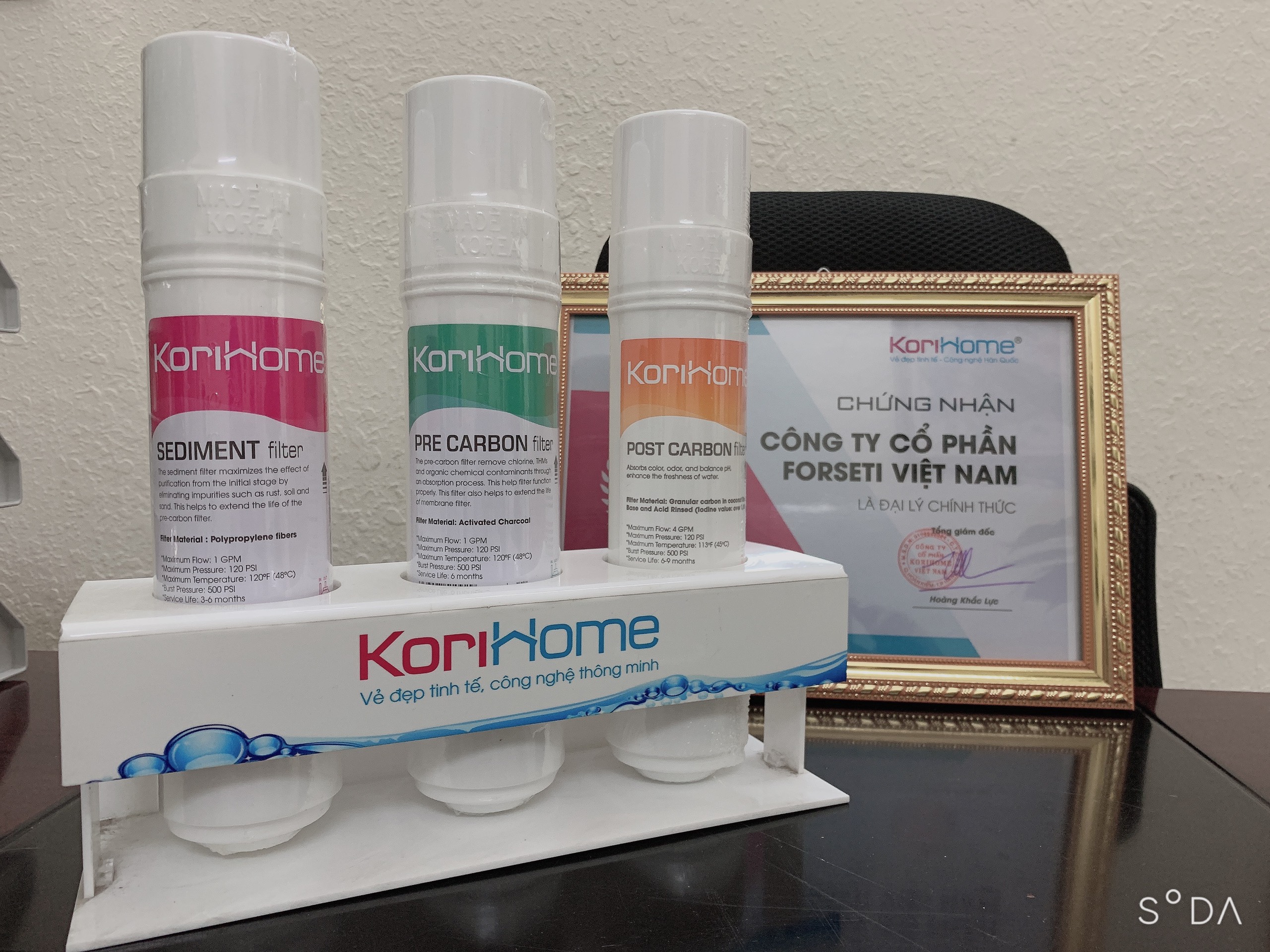 Chức năng: Giúp loại bỏ mùi hôi và các hóa chất hữu cơ, hóa chất gây ung thư Asen, Clo tồn dư trong nước Xuất xứ: Hàn Quốc (*) Thời gian thay thế lõi lọc trên được ước tính căn cứ vào bình quân mức tiêu thụ trung bình : 10 lít nước tinh khiết/ngày Lõi lọc Post Carbon: Chức năng: Hấp phụ màu, mùi, cân bằng độ pH giúp tăng vị tươi mát của nước Xuất xứ: Hàn Quốc