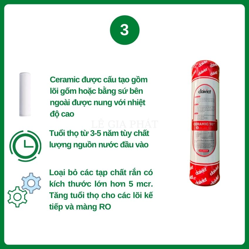 Lõi gốm Ceramic Standard có khả năng loại bỏ hoàn toàn các tạp chất, cặn bẩn, chất lơ lửng có kích thước > 0.9 micron, tiêu diệt các loại vi khuẩn, vi rút, ký sinh
