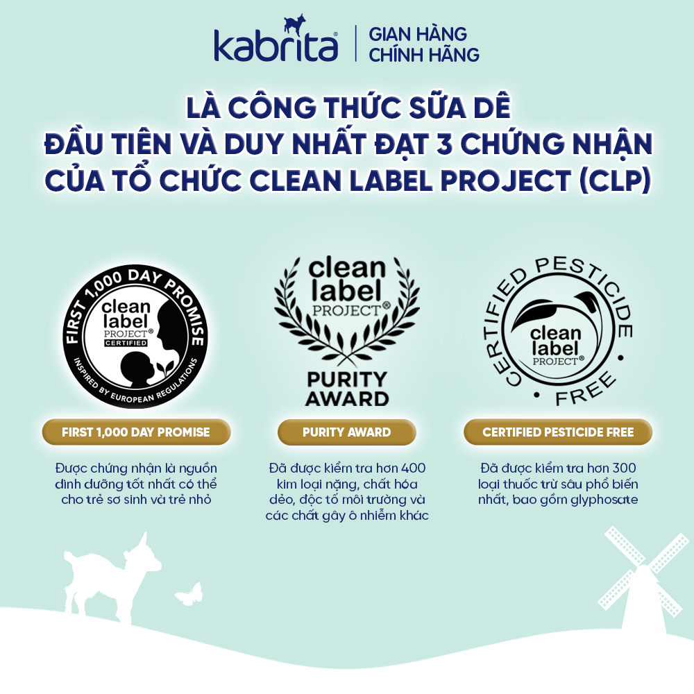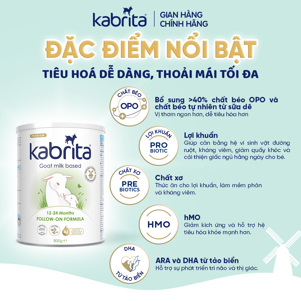 Sản phẩm dinh dưỡng công thức mới sữa dê Kabrita là sự kết hợp hoàn hảo giữa HMO 2'FL, hệ chất xơ GOS:FOS tỉ lệ vàng 9:1 và lợi khuẩn probiotics BB-12, giúp cân bằng hệ vi sinh đường ruột, mang lại cho bé hệ tiêu hóa khỏe mạnh, phân mềm, ít quấy khóc và giấc ngủ sâu hơn. Không chỉ vậy, công thức cải tiến của Kabrita còn bổ sung chất béo tự nhiên từ sữa dê cùng chất béo bổ sung OPO, tăng cường khả năng tiêu hóa và giúp bé hấp thu tối đa dưỡng chất. Sản phẩm cũng chứa đầy đủ vitamin và khoáng chất thiết yếu, hỗ trợ toàn diện sự phát triển trí não, thị giác, hệ miễn dịch và sức khỏe đường ruột của bé. Với hơn 75 năm kinh nghiệm, Kabrita cam kết kiểm soát chặt chẽ từng khâu sản xuất, từ trang trại nuôi dê đến thành phẩm cuối cùng, để mang đến cho bé yêu những sản phẩm dinh dưỡng chất lượng và an toàn nhất.