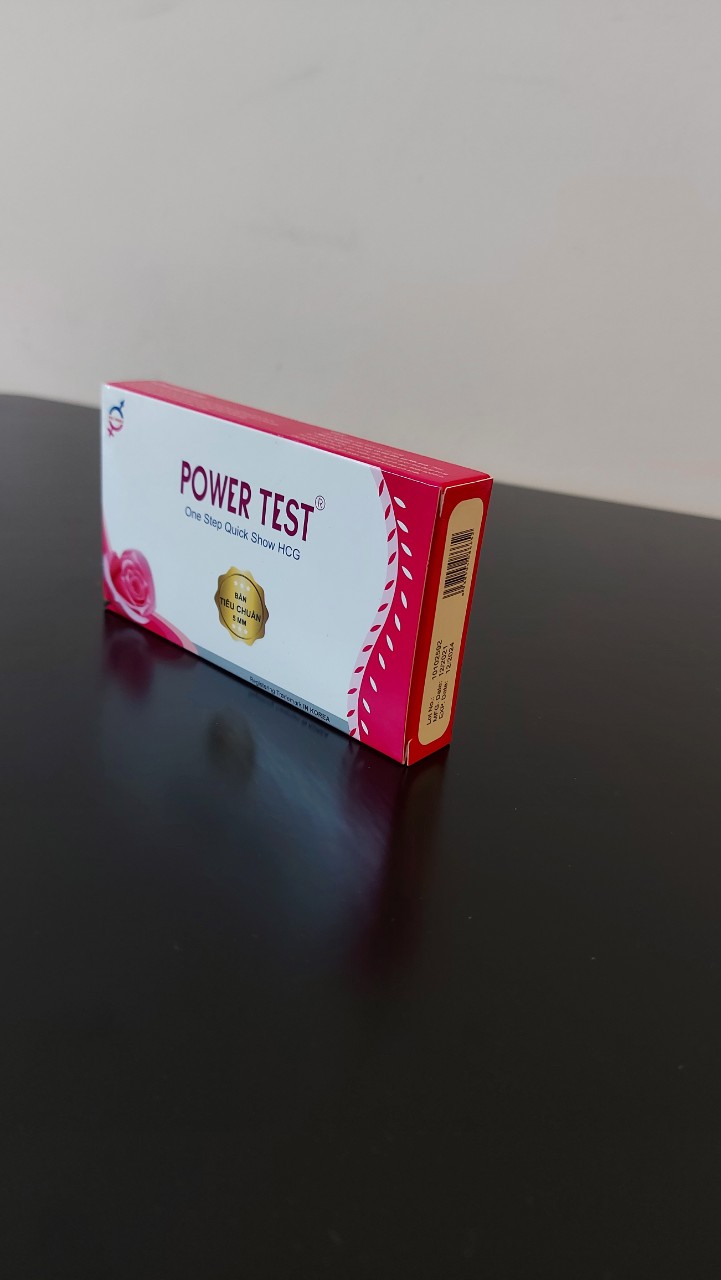 Tên sản phẩm: Que thử thai PowerTest Kích thước test: rộng 5mm Tính năng: Phát hiện thai sớm sau 6 -9 ngày trứng rụng ƯU ĐIỂM: Phát hiện thai sớm sau 6 -9 ngày