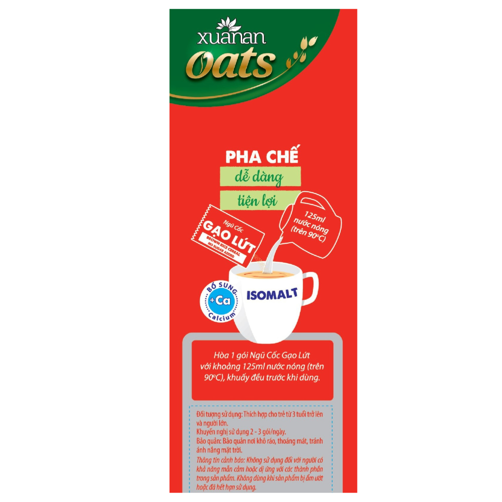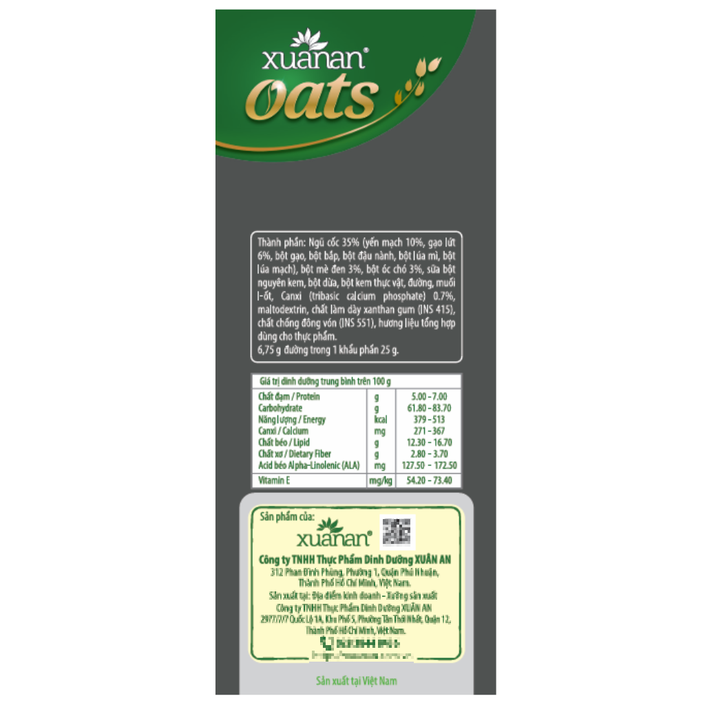 Combo Ngũ Cốc Óc Chó Mè Đen 400gr (25G16 GÓI) + Gạo Lức No Sugar 400gr (25G16 GÓI) + Yến Mạch Hạnh Nhân Hạt Chia 400gr (25G*16 GÓI) [ít đường] Ngũ cốc GẠO LỨT no Sugar là thức uống thơm ngon bổ dưỡng, được làm từ gạo lứt, yến mạch, hạt sen và rất nhiều loại ngũ cốc. Sản phẩm được bổ sung thêm can xi, sử dụng đường ăn kiêng, không sử dụng đường mía. Vitamin, khoáng chất, chất xơ tự nhiên giúp hấp thu dinh dưỡng tốt và thanh lọc cơ thể. Thành phần: Ngũ cốc 60% (bột gạo lứt 10%, yến mạch 6%, đậu đen xanh lòng 3%, nếp cẩm 3%, bắp, đậu nành, gạo, lúa mỳ, lúa mạch), hạt sen 3%, bột kem thực vật, bột dừa, sữa bột tách béo 7% (Instant skim milk powder 7%), Isomalt 3%, Canxi 0.7%, Muối I-ốt, Chất làm dày xanthan gum (E415), chất tạo ngọt (INS 951), chất chống đông vón (E551), Maltodextrin, hương liệu tổng hợp dùng cho thực phẩm. Ngũ cốc YẾN MẠCH Hạnh nhân Hạt chia giàu dinh dưỡng và năng lượng, được làm từ yến mạch và nhiều loại ngũ cốc, ngoài ra còn có Hạnh nhân và Hạt chia là hai dưỡng chất chuyên biệt. Sản phẩm được bổ sung thêm can xi và sử dụng ít đường. Vitamin, chất xơ và đạm tự nhiên là nguồn dinh dưỡng tốt cho sức khỏe. Thành phần: Ngũ cốc 35% (Yến mạch 10%, bột gạo lứt 6%, bột gạo, bột bắp, bột đậu nành, bột lúa mì, bột lúa mạch), Hạt chia 3%, bột Hạnh nhân 3%, sữa bột nguyên kem, bột dừa, bột kem thực vật, đường, muối i-ốt, Canxi 0.7%, maltodextrin, chất là dày xanhthan gum (E415), chất chống đông vón (E551), hương liệu tổng hợp dùng cho thực phẩm. 6.75 gr đường trong khẩu phần 25g. Yến Mạch, Óc chó và Mè đen là ba loại hạt được dùng khá phổ biến đối với mỗi gia đình vì chúng có tác dụng rất tốt cho sức khỏe. Đặc biệt, chúng phù hợp sử dụng với nhiều lứa tuổi, ngay cả trẻ nhỏ. Khi kết hợp 3 nguyên liệu này trong chế biến ngũ cốc thì chúng là loại ngũ cốc “Ngũ cốc Yến mạch, Óc chó và Mè đen” siêu hương vị thơm ngon, dinh dưỡng, ngậy béo nhưng không ngấy. Đối tượng sử dụng: Trẻ từ 3 tuổi trở lên và người lớn, người ăn theo chế độ giảm đường. Hướng dẫn sử dụng: Hòa 1 gói Ngũ cốc YẾN MẠCH Hạnh nhân Hạt chia với khoảng 125ml nước sôi, khuấy đều trước khi dùng. Dùng 2-3 gói mỗi ngày Bảo quản: Bảo quản nơi khô ráo, thoáng mát; tránh tiếp xúc trực tiếp với không khí và ánh nắng mặt trời. Thông tin cảnh báo: Không dùng khi sản phẩm bị rách, mốc hoặc đã hết hạn sử dụng Sản phẩm của: Công ty TNHH Thực Phẩm Dinh Dưỡng Xuân An