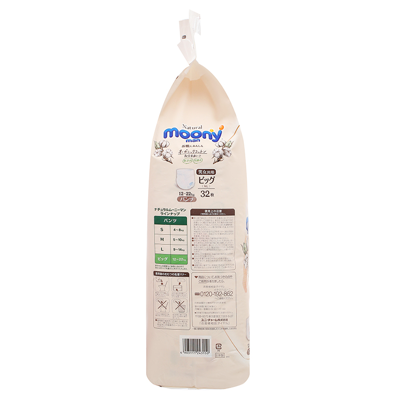 Mua tại TiktokBỉm - Tã quần Moony Natural size XL 32 miếng (12 - 22kg) Giới thiệu Bỉm tã quần moony Natural size XL32 miếng (12 - 22kg) chính là 1 trong những mẫu cải tiến mới với lưng thun che phủ trên eo co giãn linh hoạt để chống tràn hiệu quả, từ đó cho bé sự thoáng mát tối đa. Loại bỏ hoàn toàn vấn đề gây in hằn da khi bé đến giai đoạn chuyển từ bỉm dán sang bỉm quần. Đặc biệt đây là sản phẩm bỉm siêu cao cấp với bề mặt Organic đầu tiên tại Nhật Bản an toàn với làn da non nớt của bé Đặc điểm nổi bật Màng vải lưng thun, co giãn nhẹ như mây