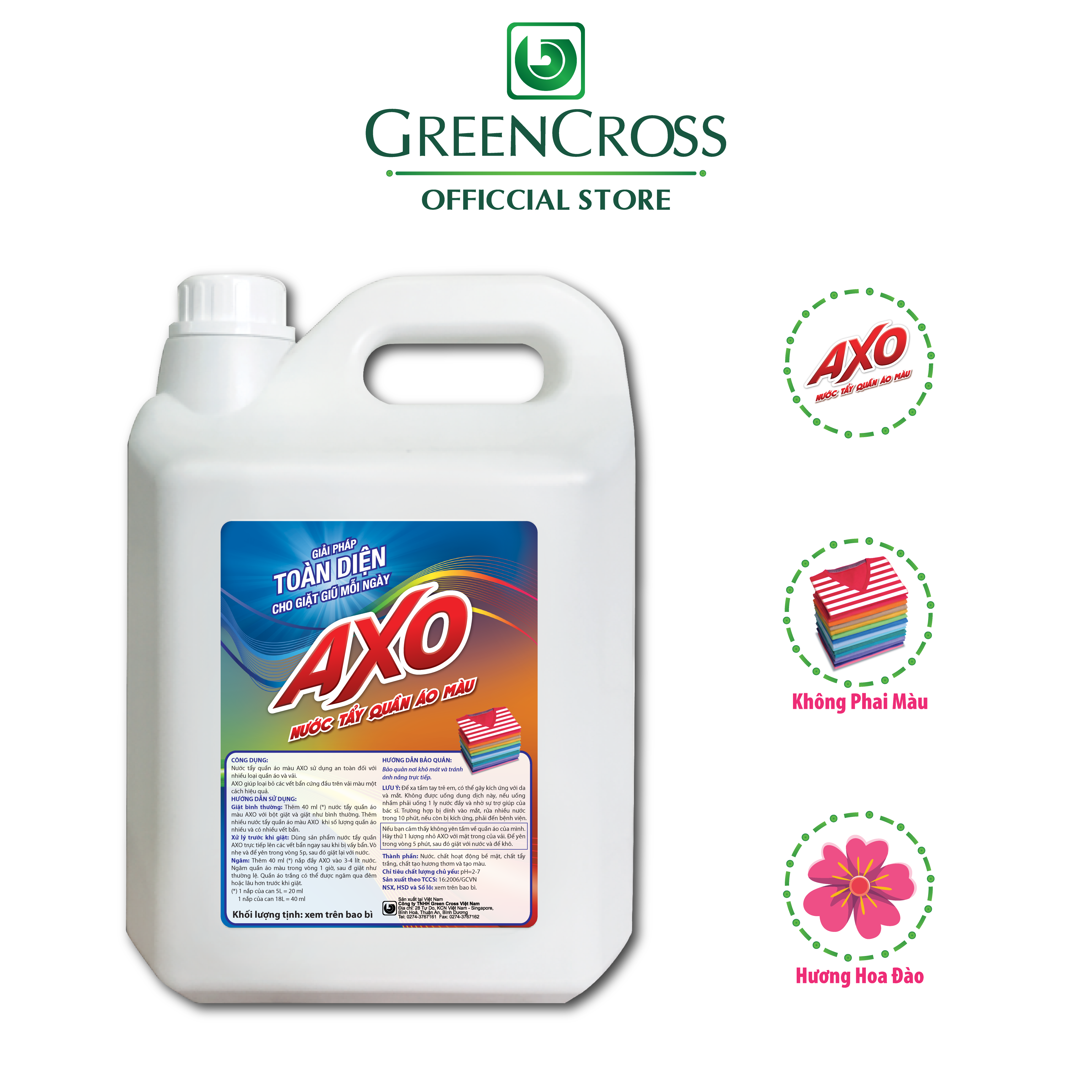 - Với công nghệ từ Philippines, AXO giúp tẩy sạch các vết bẩn trên quần áo màu như Cafe, Cari, dầu nhớt, vết mực, vết bút bi mà không làm bay màu quần áo.