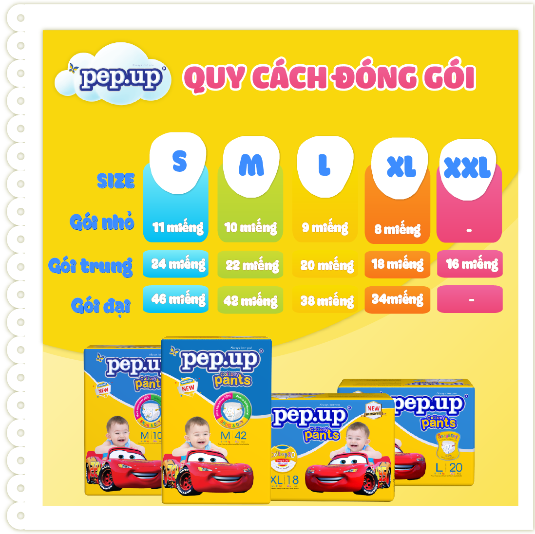 Tã/Bỉm Quần Em Bé Pep.up Cottony 3D Gói Đại Siêu Mềm Mại, Siêu Khô Thoáng, Kháng khuẩn Size S/M/L/XLI. THÔNG TIN SẢN PHẨMThương hiệu: Xuất xứ: Việt NamSản xuất tại: Công ty TNHH Javi - Lô LE6-02 Đ...