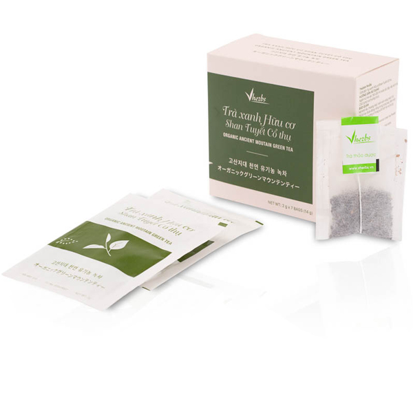 TRÀ XANH HỮU CƠ Shan Tuyết Cổ Thụ (túi lọc) NSX & HSD: Xem trên bao bì sản phẩm Hướng dẫn sử dụng: Ngâm túi trà vào 200ml nước sôi, đậy nắp tách trà. Chờ 3 - 5 phút, thưởng thức. Có thể pha 2 lần nước Bảo quản: Nơi khô ráo, thoáng mát. Tránh ánh sáng trực tiếp. Trà được đóng riêng từng bao, đảm bảo giữ nguyên hương vị trong suốt thời gian sử dụng Xuất xứ: Việt Nam  Sản xuất tại: CÔNG TY CỔ PHẦN VIỆT HERBS Giới thiệu trà hữu cơ Shan tuyết cổ thụ VHERBS Trà Shan tuyết cổ thụ Vherbs, thuộc vùng trà cổ tự nhiên hàng trăm năm tuổi trên vùng núi cao  1300 – 1900 m thuộc  huyện Hoàng Su Phì, tỉnh  Hà Giang. Một huyện miền núi với cung đèo đẹp nhưng cũng hiểm trở nhất của tỉnh Hà Giang.  Theo kinh nghiệm gia truyền của các bậc lão niên , để có ấm trà ngon phải đảm bảo đủ các yếu tố: