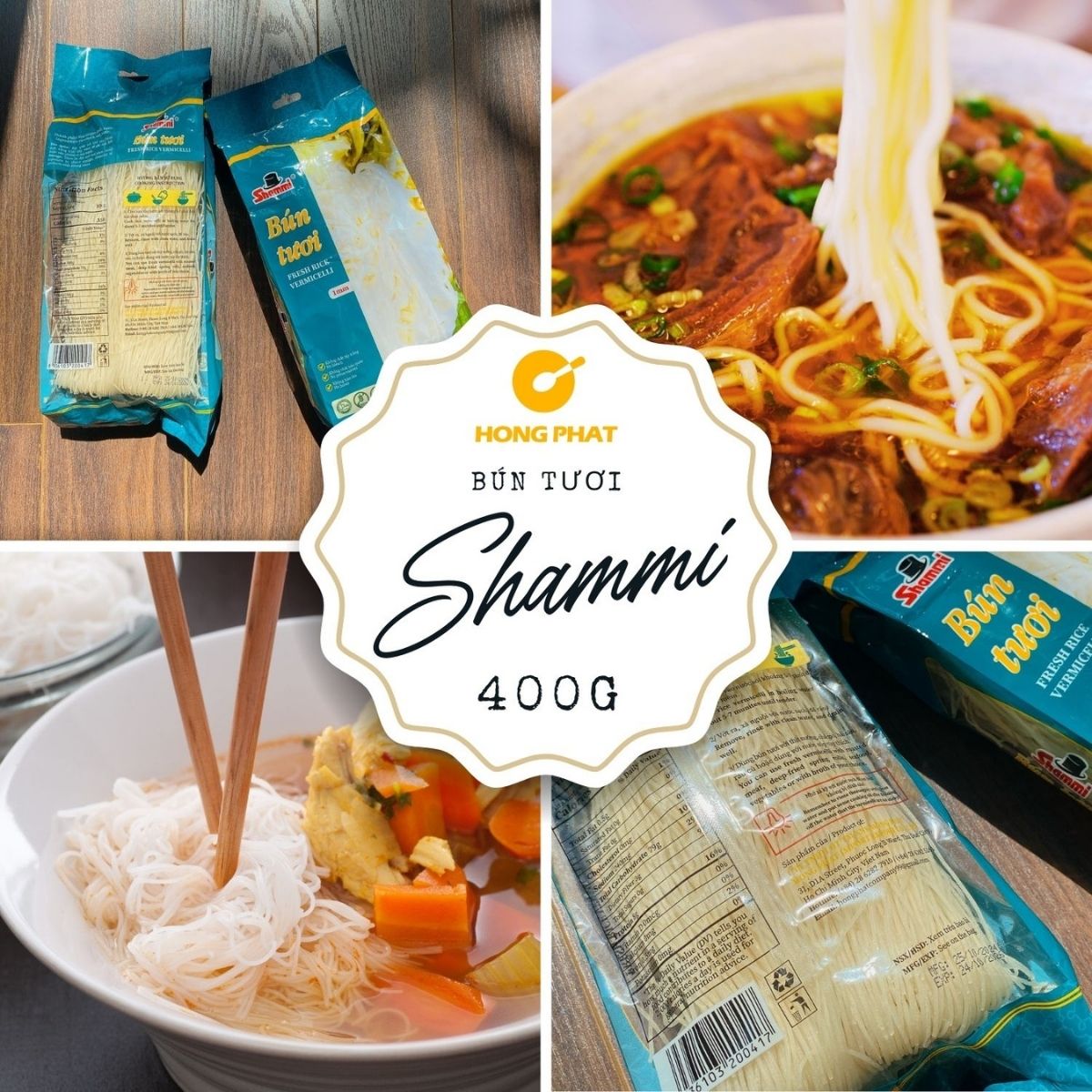 Sợi bún vừa, tròn, màu trắng được làm từ bột gạo nguyên chất chất lượng, đảm bảo an toàn. Bún tươi Shammi gói 400g giúp bạn bảo quản được lâu. Bún Tươi có thể dùng
