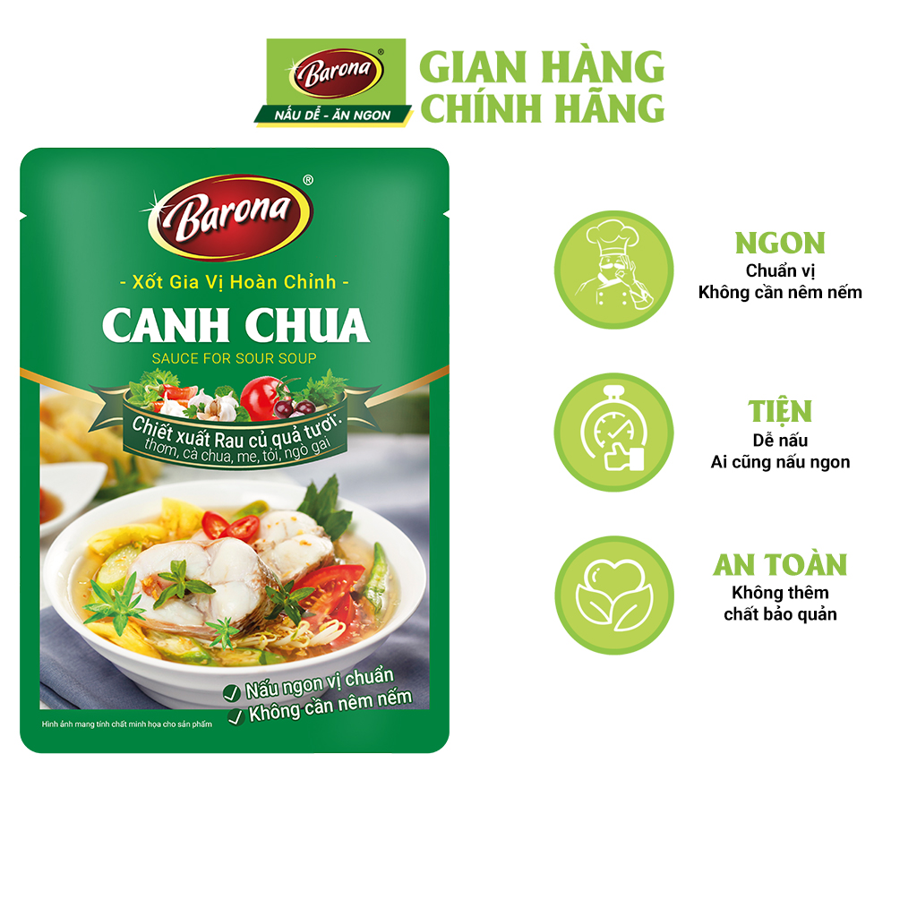 XỐT GIA VỊ HOÀN CHỈNH BARONA CANH CHUA 80G Xốt Gia Vị Hoàn Chỉnh Barona là công thức phối trộn độc đáo giữa CHIẾT XUẤT RAU CỦ QUẢ TƯƠI như hành, tỏi, me, cà chua…cùng