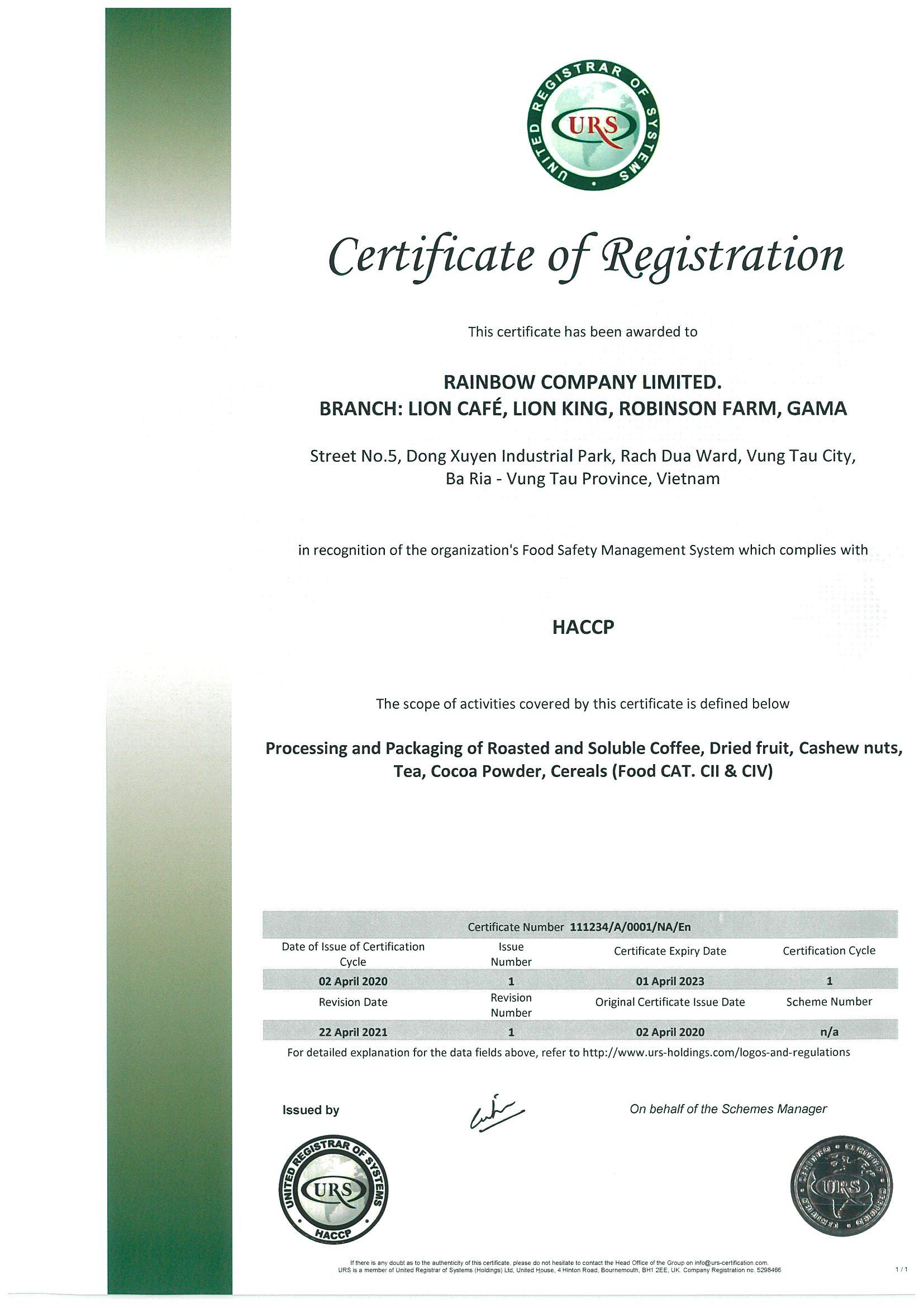 Các chứng chỉ công ty và Cafe Hoà Tan Lion 4in1 Capuccino Vị Dừa đã được công nhận: