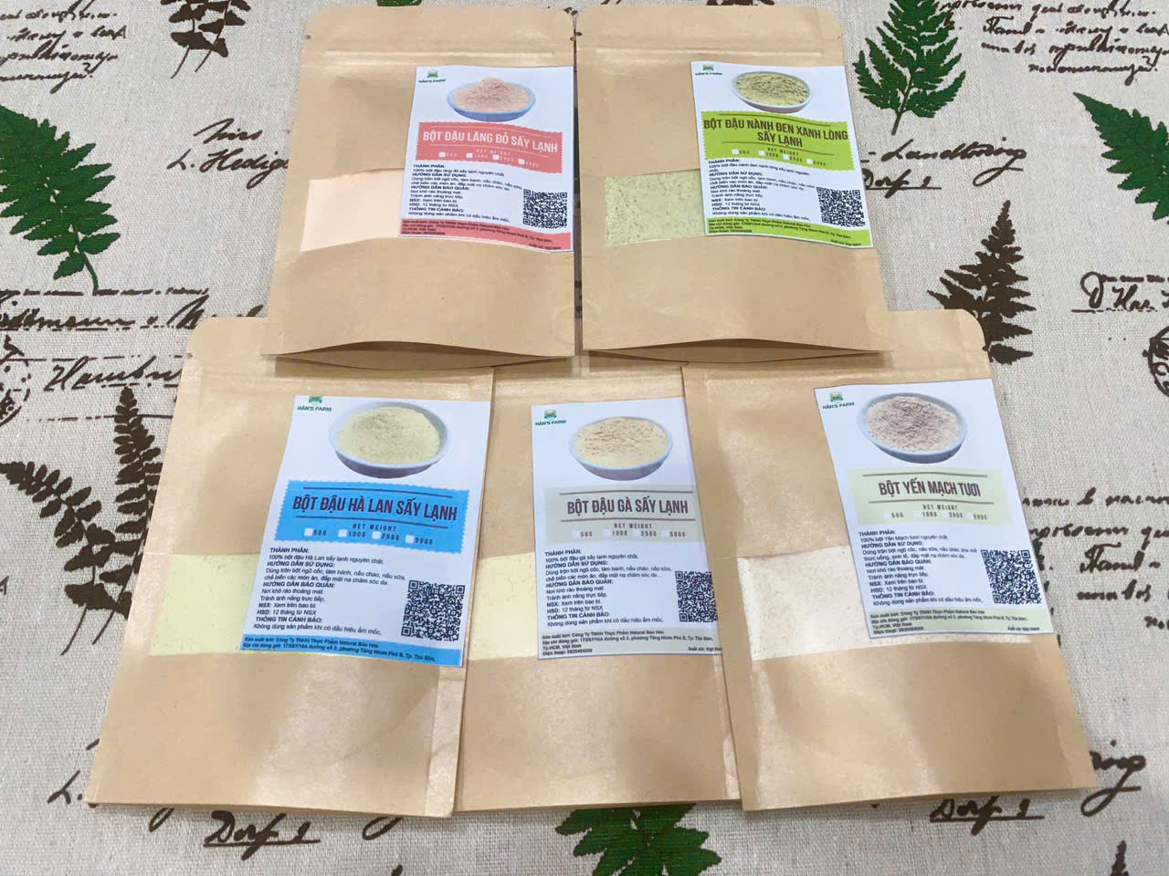 Combo sản phẩm gồm 5 loại bột sấy lạnh là bột đậu gà, bột đậu lăng đỏ, bột đậu hà lan, bột đậu nành đen xanh lòng sấy lạnh, bột yến mạch tươi nguyên chất siêu mịn, không biến đổi gen Tại sao bạn nên chọn bột sấy lạnh nhà Hân's Farm?