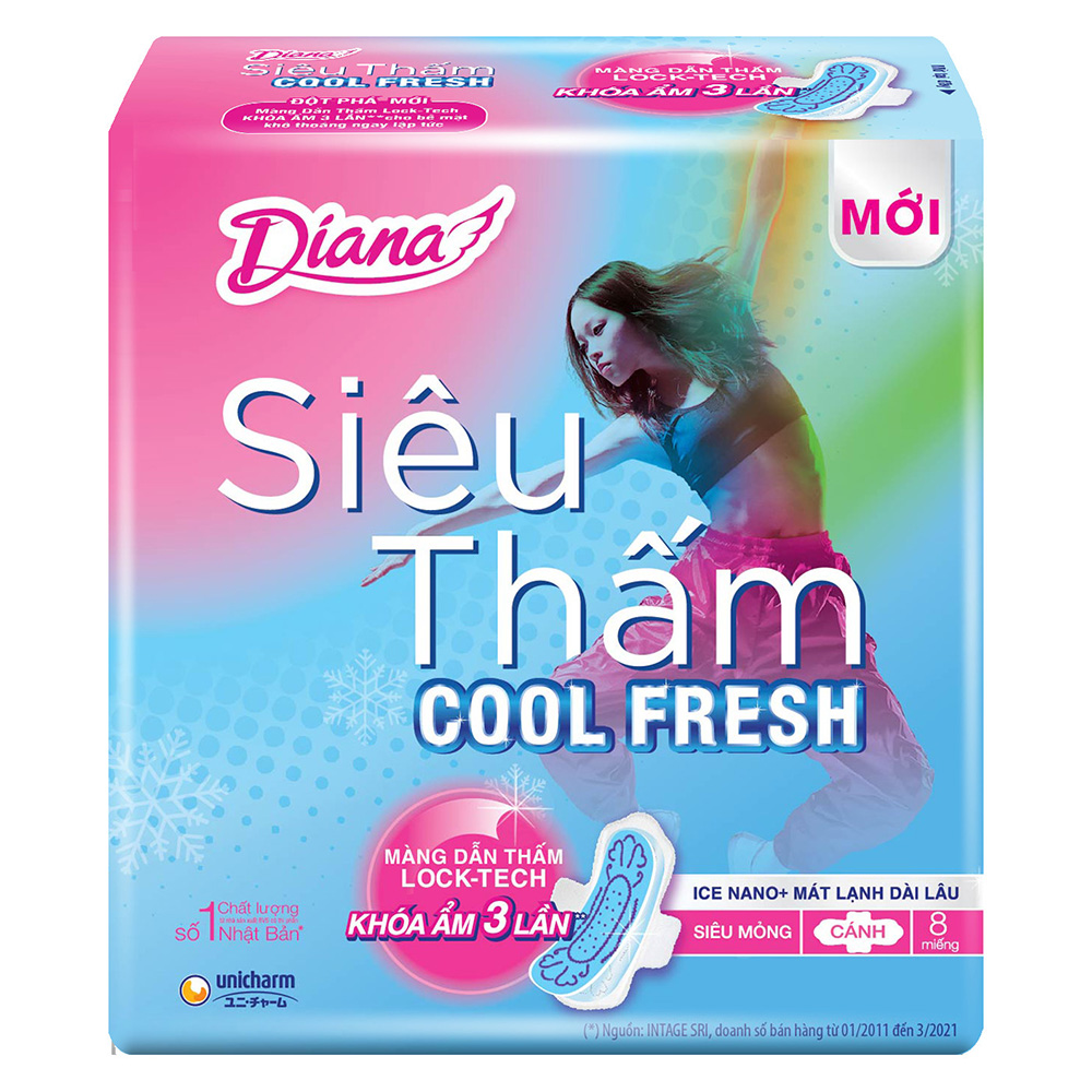 Băng vệ sinh Diana Siêu thấm Cool Fresh Siêu mỏng Cánh gói 8 miếng là loại băng vệ sinh đáp ứng các yêu cầu vừa mềm mại, vừa thấm hút tốt, đồng thời phải thật mỏng và không co dúm của phái đẹp. Sản phẩm ứng dụng công nghệ vi sợi kép độc quyền của Tập đoàn Unicharm, vừa có bề mặt vi sợi thấm tan chất dịch đặc (đặc trưng cho dòng sản phẩm Diana Sensi) khô thoáng tối đa, vừa có lõi vi sợi chỉ mỏng 0.1cm siêu nhẹ, không hề co dúm và chống thấm ngược vượt trội. Sản phẩm là sự lựa chọn tối ưu dành cho phái đẹp trong những ngày "nhạy cảm" vì đột phá với cấu trúc gập đa lớp giúp ngăn chất lỏng thấm lan sang 2 bên mà vẫn thật êm mềm.