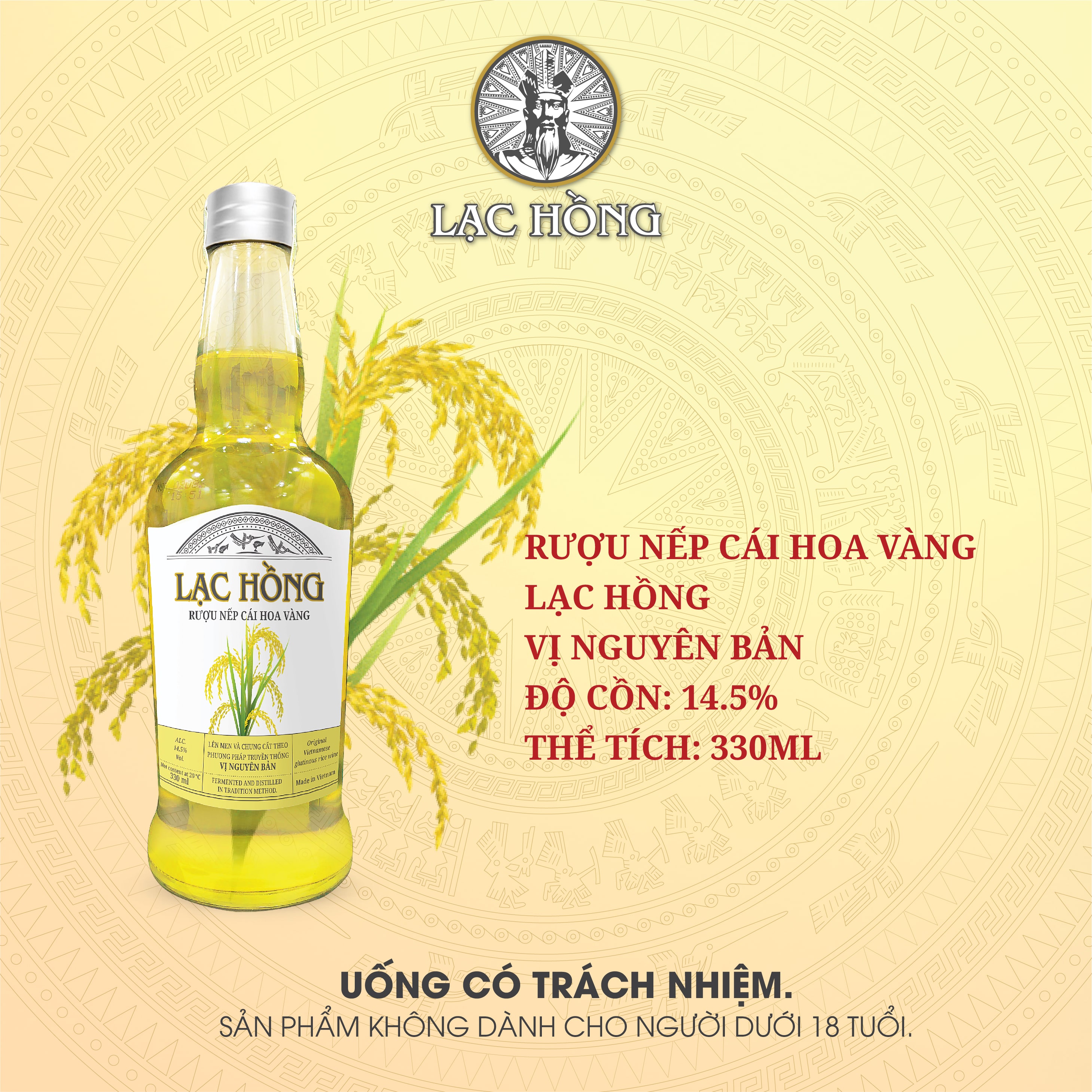 Rượu Nếp Cái Hoa Vàng Lạc Hồng (14.5%) Rượu Nếp Cái Hoa Vàng Lạc Hồng mang hương vị truyền thống đậm đà, được sản xuất từ gạo nếp cái hoa vàng Việt Nam nổi tiếng.