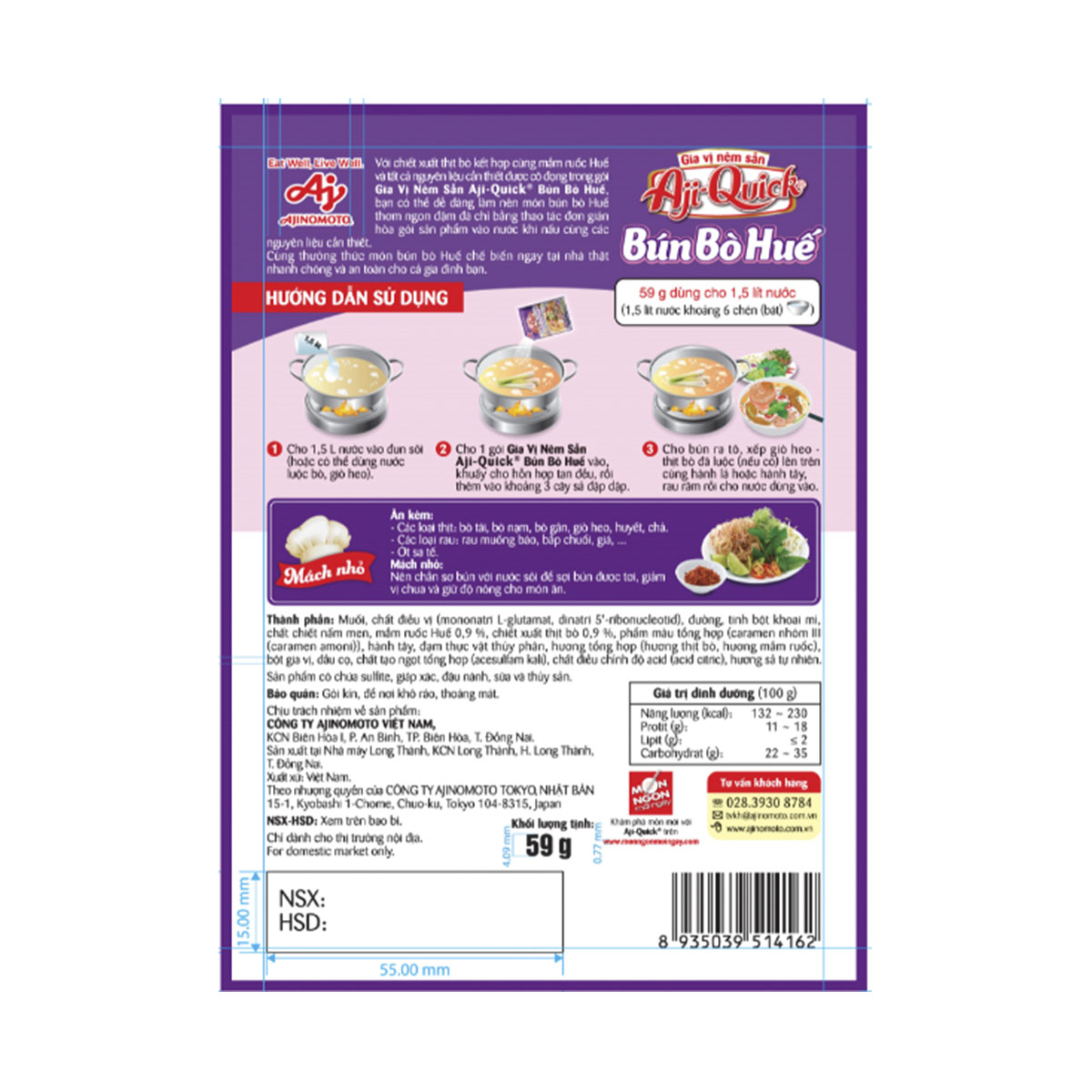Lốc 6 gói Bún Bò Huế Aji-Quick 59g Bún bò Huế là một trong những món ăn đặc trưng của Việt Nam xuất phát từ miền Trung và ngày nay rất phổ biến ở nhiều địa phương đồng thời được du khách quốc tế rất ưa chuộng. Anthony Bourdain một đầu bếp kiêm dẫn chương trình thực tế nổi tiếng tại Mỹ đã từng nhận xét Bún bò Huế là món súp ngon nhất thế giới. Để nấu được món Bún bò Huế truyền thống, người nội trợ cần phải hầm xương sử dụng làm nước dùng lên đến 4 tiếng đồng hồ và phải kết hợp nhiều gia vị. Thấu hiểu được điều đó, CÔNG TY AJINOMOTO VIỆT NAM đã cho ra mắt sản phẩm Gia vị nêm sẵn Aji-Quick Bún Bò Huế. Với sản phẩm này, người nội trợ chỉ cần hòa gói sản phẩm với đúng liều lượng nước, cả gia đình sẽ nhanh chóng được thưởng thức món Bún bò Huế thơm ngon đúng vị mà không cần nêm nếm thêm gia vị, giúp tiết kiệm thời gian nấu nướng mà vẫn đem lại giá trị dinh dưỡng. Ruốc Huế đặc trưng, nước dùng đậm vị. Hướng dẫn sử dụng: Bước 1: Cho 1,5 lít nước vào đun sôi (hoặc có thể dùng nước luộc bò, giò heo) Bước 2: Cho 1 gói Gia Vị Nêm Sẵn Aji-Quick Bún Bò Huế vào, khuấy cho hỗn hợp tan đều, rồi thêm vào khoảng 3 cây sả đập dập Bước 3: Cho bún ra tô, xếp giò heo, thịt bò đã luộc (nếu có) lên trên cùng hành lá hoặc hành tây, rau răm rồi cho nước dùng vào. Thành phần: Muối, chất điều vị (mononatri L-glutamat, dinatri 5'-ribonucleotid), đường, tinh bột khoai mì, chất chiết nấm men, mắm ruốc Huế 0,9%, chiết xuất thịt bò 0,9%, phẩm màu tổng hợp (caramen nhóm III (caramen amoni)), hành tây, đạm thực vật thủy phân, hương tổng hợp (hương thịt bò, hương mắm ruốc), bột gia vị, dầu cọ, chất tạo ngọt tổng hợp (acesulfam kali), chất điều chỉnh độ acid (acid citric), hương sả tự nhiên.   Hạn sử dụng 15 tháng kể từ ngày sản xuất. Bảo quản nơi khô thoáng tráng ánh nắng trực tiếp. Xuất xứ: Việt Nam         Thông tin thương hiệu Được thành lập từ năm 1991, Công ty Ajinomoto Việt Nam là công ty 100% vốn đầu tư nước ngoài thuộc Tập đoàn Ajinomoto, Nhật Bản. Công ty Ajinomoto Việt Nam luôn nỗ lực không ngừng trong việc nghiên cứu phát triển để mang đến nhiều chủng loại sản phẩm thực phẩm và gia vị với chất lượng tốt nhất, an toàn, phù hợp với khẩu vị của người Việt. Bên cạnh đó, chúng tôi luôn mong muốn đóng góp vào sự phát triển của nền văn hóa ẩm thực đặc sắc của Việt Nam qua việc tư vấn, giới thiệu những hương vị mới và cách thưởng thức món ăn mới cho người Việt, mang lại những bữa ăn ngon và hạnh phúc cho mọi gia đình.