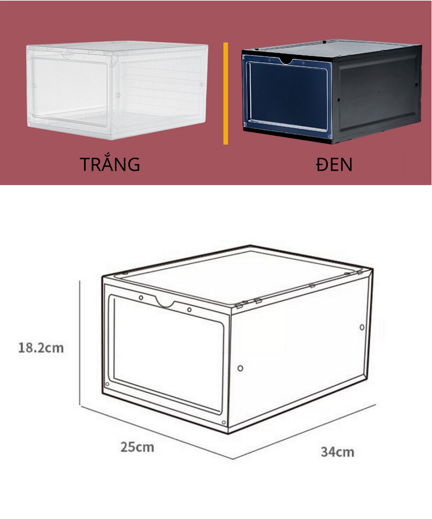 THÔNG TIN SẢN PHẨM • Kích thước 34x25x18cm • Hộp giúp bảo quản những đôi giày khỏi bụi bẩn. • Cửa mở trong suốt có thể nhìn thấy giày bên trong. • Chồng các hộp