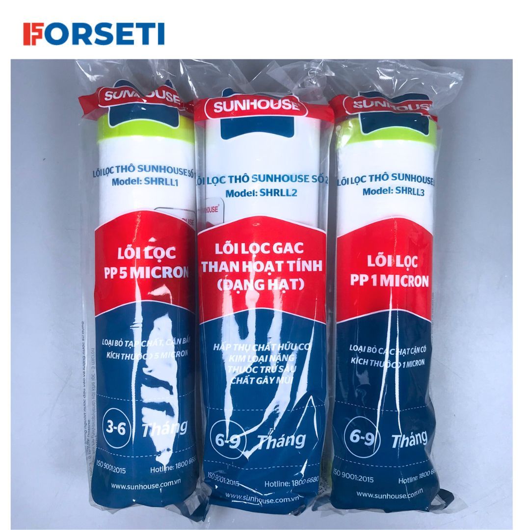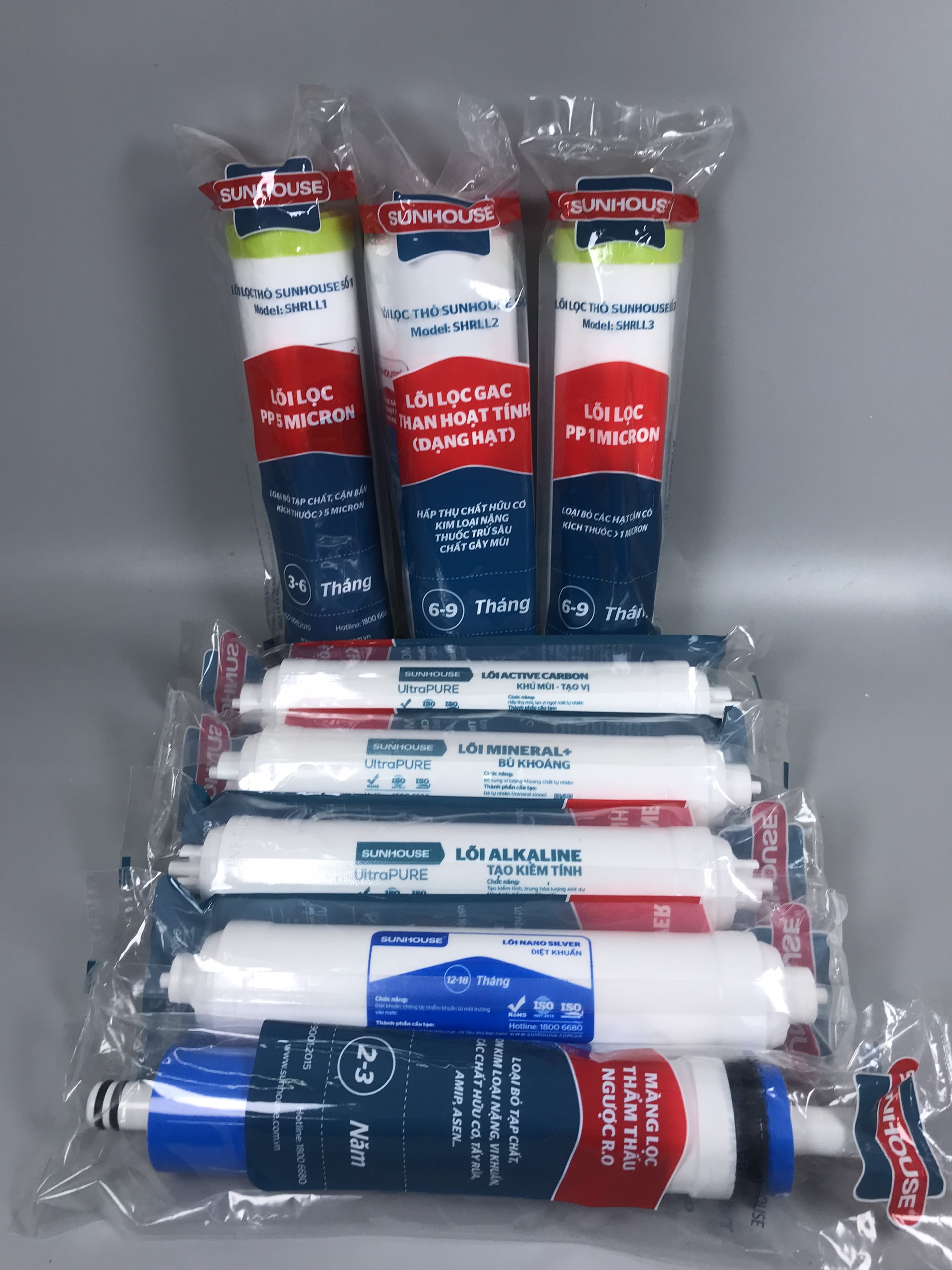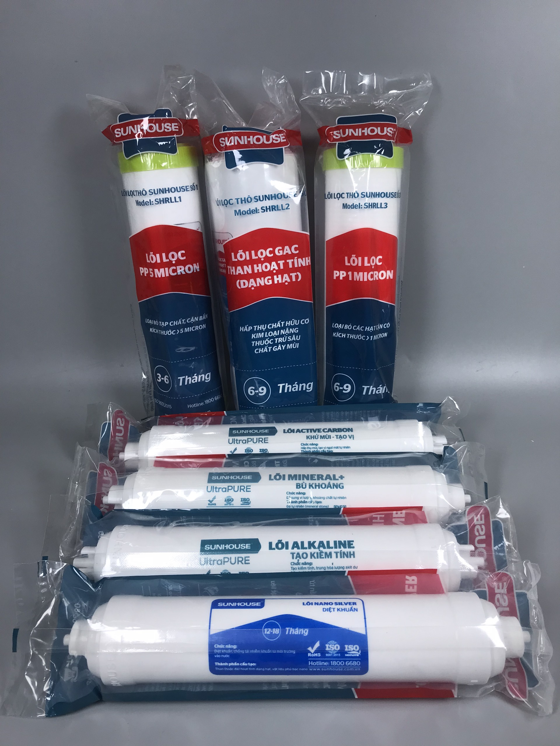 COMBO TRỌN BỘ 8 LÕI LỌC SUNHOUSE Có 2 phân loại hàng nên khách hàng lưu ý lựa chọn đúng sản phẩm mình muốn mua!  LÕI SỐ 1 PP 5 MICRON Nguyên liệu: Sợi Polypropylene Chức năng: Loại bỏ tạp chất, cặn bẩn, kim loại nặng... kích thước > 5 micron và tăng tuổi thọ cho các lõi kế tiếp Tuổi thọ: 3-6 tháng LÕI SỐ 2 OCB-GAC Nguyên liệu: Than hoạt tính (Dạng hạt) Chức năng: Hấp thụ chất hữu cơ, kim loại nặng, thuốc trừ sâu, chất gây mùi Tuổi thọ: 6-9 tháng LÕI SỐ 3 PP 1 MICRON Nguyên liệu: Sợi Polypropylene Chức năng: Loại bỏ hạt cặn, kim loại nặng... kích thước > 1 micron và bảo vệ màng RO Tuổi thọ: 6-9 tháng LÕI SỐ 4 - MÀNG RO SUNHOUSE Nguyên liệu: Màng R.O thẩm thấu ngược với khe lọc 0.0001 micron và vật liệu Polyamide Chức năng: Loại bỏ tạp chất, ion kim loại nặng, vi khuẩn, các chất hữu cơ, chất tẩy rửa, a.m.i.p, a.s.e.n..., cho ra nước tinh khiết Tuổi thọ: 2-3 năm   LÕI SỐ 5 NANO SILVER Nguyên liệu: Than (hoặc đá) hoạt tính dạng hạt, vật liệu phủ bạc nano Chức năng: Diệt khuẩn, chống tái nhiễm khuẩn từ môi trường vào nước Tuổi thọ: 12-18 tháng LÕI SỐ 6 ALKALINE Nguyên liệu: Hạt khoáng Alkaline Chức năng: Tạo kiềm tính, trung hòa lượng axit dư, nâng độ pH của nước và bổ sung điện giải Tuổi thọ: 12-18 tháng LÕI SỐ 7 MINERAL Nguyên liệu: Đá tự nhiên (mineral stone) Chức năng: Bù khoáng, bổ sung vi lượng và khoáng chất tự nhiên cho nước Tuổi thọ: 12-18 tháng   LÕI SỐ 8 ACTIVE CARBON Nguyên liệu: Than hoạt tính dạng hạt Chức năng: Hấp thụ mùi, tạo vị ngọt mát tự nhiên cho nước, giúp cho nước dễ uống hơn, mà vẫn đảm bảo tinh khiết và an toàn với sức khỏe Tuổi thọ: 12-18 tháng