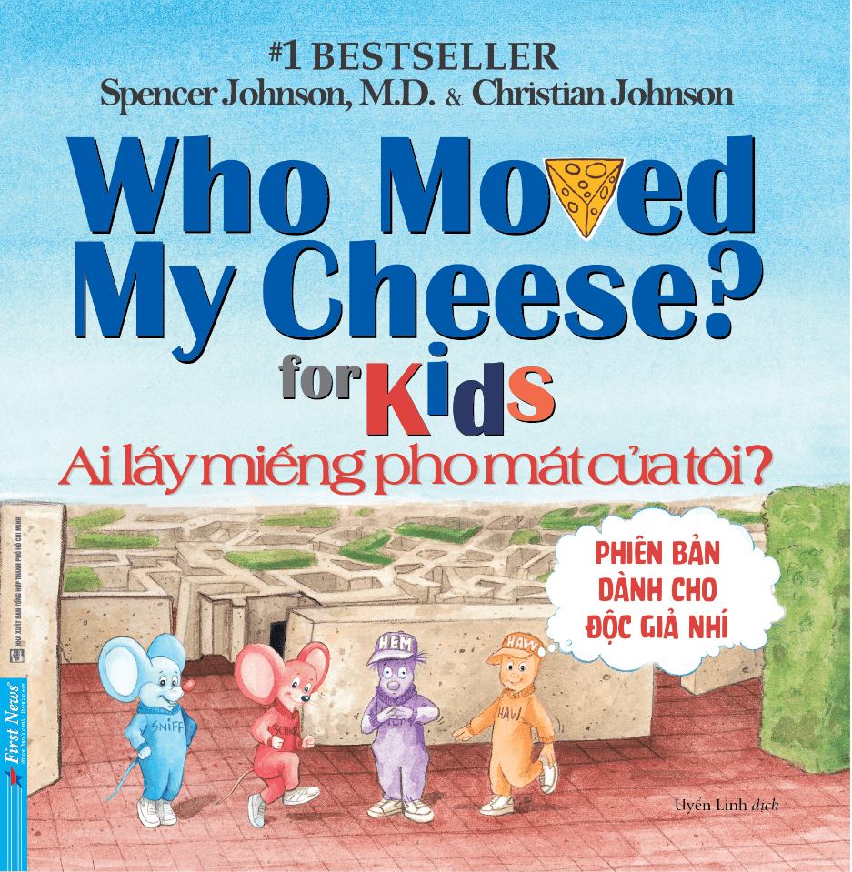 - AI LẤY MIẾNG PHO MÁT CỦA TÔI (DÀNH CHO ĐỘC GIẢ NHÍ) Giá bìa: 68.000VND Mô tả sản phẩm: Ai lấy miếng pho mát của tôi? phiên bản dành cho độc giả nhí tiếp tục là câu chuyện ngụ ngôn kể về hai chú chuột và hai con người tí hon cùng chung sống trong một mê cung rộng lớn, luôn tất bật đi tìm những miếng phó mát để nuôi sống mình và để cảm thấy hạnh phúc. Các nhân vật chính bao gồm: hai chú chuột có tên là Đánh Hơi và Nhanh Nhẹn, hai người tí hon có tên là Ù Lì và Chậm Nhỏ. Một ngày kia, cả bốn nhân vật phải đối mặt với sự thay đổi, một biến cố khủng khiếp: Đó là toàn bộ số pho mát trong kho của họ đã biến mất. Và mỗi nhân vật có những phản ứng khác nhau tùy theo tính cách riêng của mỗi người. Ẩn chứa trong câu chuyện là những bài học sâu sắc về sự thay đổi, được dần tiết lộ qua mỗi chặng tìm kiếm pho mát trong mê cung. Vì dành cho lứa tuổi thiếu nhi, cốt truyện của Ai lấy miếng pho mát của tôi? phiên bản nhí được cô đọng và thiết kế sinh động, đầy màu sắc. Các nhân vật chính được phân biệt bởi màu sắc và tên trên mũ và áo liền quần.