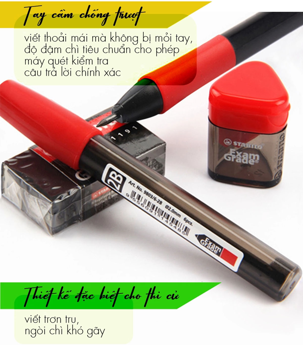 - Vị trí cầm bút có đệm cao su chống trơn - Bút chì bấm nét 2.0mm - Thích hợp dùng tô bài thi trắc nghiệm, vẽ thông thường - Được làm từ chất liệu
