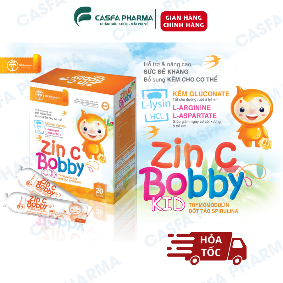 Combo Canxi Hữu Cơ Cho Bé: CANXI BOBBY và Kẽm ZIN C BOBBY KID TW Hanopharco ✪ THÀNH PHẦN CANXI BOBBY Trong 100ml có chứa: Canxi gluconat: 5000mg L-lysin HCl: 5000mg Canxi lactat: 2500mg Inulin: 500mg Taurin: 250mg Sữa non: 250mg Yến sào: 250mg Thymomodulin: 50mg Vitamin PP: 20mg Vitamin B1: 20mg Vitamin B6: 20mg Vitamin K2-MK7: 500mcg Vitamin D3: 2500IU Phụ liệu: Đường, nước tinh khiết, natri citrate, natri benzoate, kali sorbate vừa đủ 100ml. ✪ CÔNG DỤNG CANXI BOBBY Hỗ trợ bổ sung Canxi và Vitamin D cho cơ thể. Giúp phát triển chiều cao cho trẻ trong độ tuổi tiền dậy thì và dậy thì. Cung cấp các vitamin thiết yếu giúp phát triển hệ xương và răng chắc khỏe. Ngăn ngừa loãng xương cho người lớn, bổ sung Canxi theo chỉ định của bác sĩ. ✪ ĐỐI TƯỢNG SỬ DỤNG Trẻ em còi xương, chậm lớn, chậm mọc răng. Trẻ trong độ tuổi phát triển chiều cao (tiền dậy thì và dậy thì). Người lớn tuổi, muốn ngăn ngừa loãng xương. Người cần bổ sung Canxi theo chỉ định. ✪ CÁCH DÙNG CANXI BOBBY Trẻ từ 6 tháng - 6 tuổi: 1 gói 10ml/ngày (sáng và trưa sau ăn). Trẻ trên 6 tuổi, người lớn, phụ nữ có thai và cho con bú: 2 gói 10ml/ngày. ✪ Kẽm ZIN C BOBBY KID - Hỗ Trợ Biếng Ăn và Tăng Cường Sức Đề Kháng Cho Trẻ (Hộp 20 Gói) ✪ THÀNH PHẦN KẼM ZIN C BOBBY KID L-lysine HCl: 500mg L-arginine L-Aspartate: 500mg Bột tảo spirulina: 500mg Inulin: 500mg Kẽm gluconate: 250mg Bột Chùm ngây: 100mg Yến sào: 100mg Taurine: 100mg Mật ong: 45mg Thymomodulin: 20mg Vitamin PP: 10mg Vitamin B1: 10mg Vitamin B2: 10mg DHA 10%: 150mcg Phụ liệu: Đường, hương thơm, natri benzoate, nước, màu thực phẩm vừa đủ 100ml. ✪ CÔNG DỤNG KẼM ZIN C BOBBY KID Cung cấp kẽm, lysine và DHA giúp cải thiện biếng ăn và tăng cường sức đề kháng. Hỗ trợ cải thiện tình trạng suy dinh dưỡng, tiêu chảy và tiêu hóa kém. Tăng cường khả năng hấp thụ dinh dưỡng và hỗ trợ sự phát triển toàn diện của trẻ. ✪ ĐỐI TƯỢNG SỬ DỤNG KẼM ZIN C BOBBY KID Trẻ em cần bổ sung kẽm, lysine, DHA cho cơ thể. Trẻ có biếng ăn, sức đề kháng yếu, tiêu hóa kém hoặc bị tiêu chảy. Trẻ bị suy dinh dưỡng, sau ốm hoặc cần phát triển toàn diện. ✪ CÁCH DÙNG KẼM ZIN C BOBBY KID Trẻ từ 6 tháng - 3 tuổi: 1 ống 10ml/ngày. Trẻ 4 - 8 tuổi: 2 lần/ngày, mỗi lần 1 ống 10ml. Trẻ từ 9 tuổi trở lên: 3 lần/ngày, mỗi lần 10ml. LƯU Ý: Sản phẩm không phải là thuốc và không thay thế thuốc chữa bệnh. CAM KẾT VỚI KHÁCH HÀNG Cam kết 100% sản phẩm chính hãng. Sản phẩm chất lượng, dịch vụ khách hàng chu đáo.