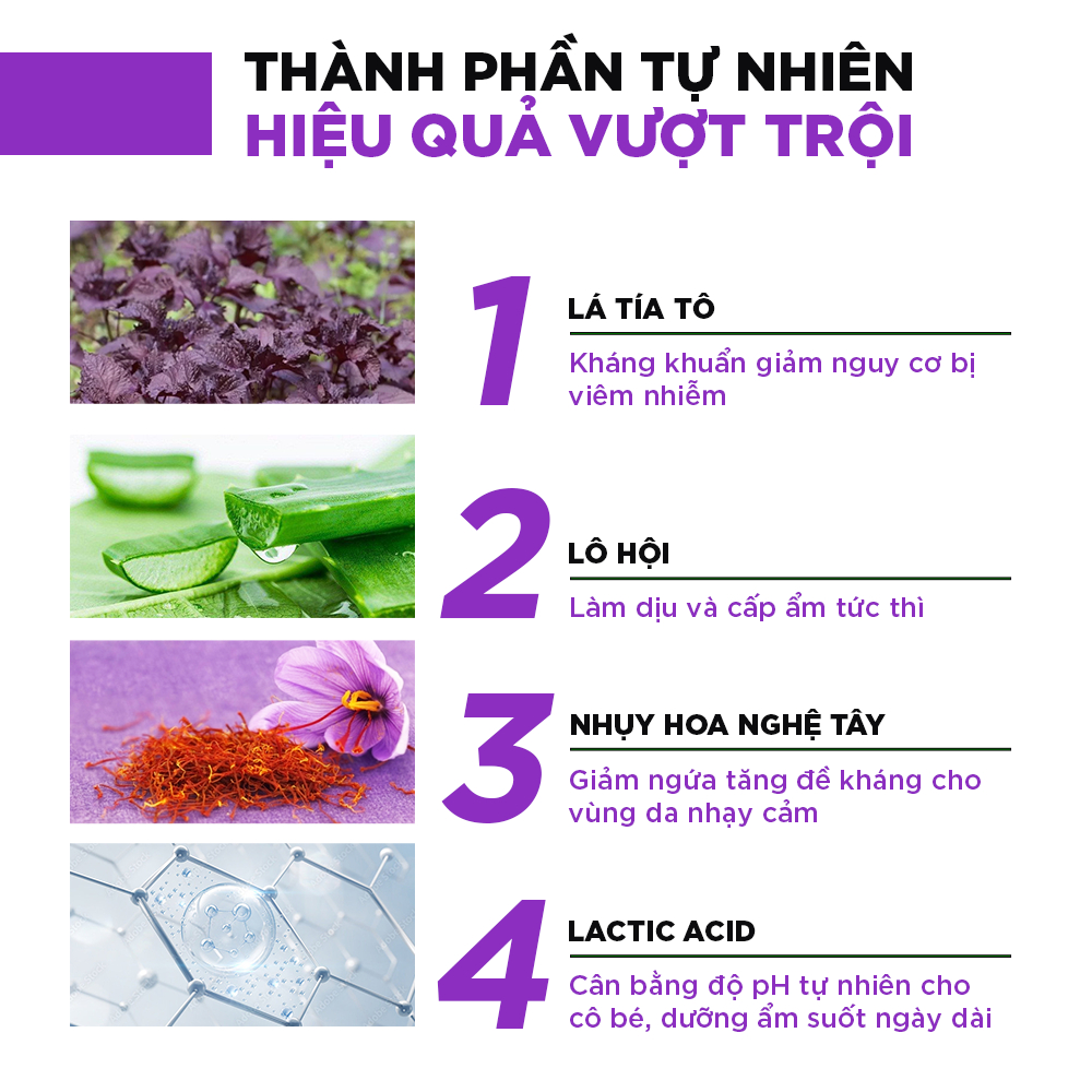 - Thành phần thiên nhiên an toàn (Tía Tô, Nhụy Hoa Nghệ Tây)