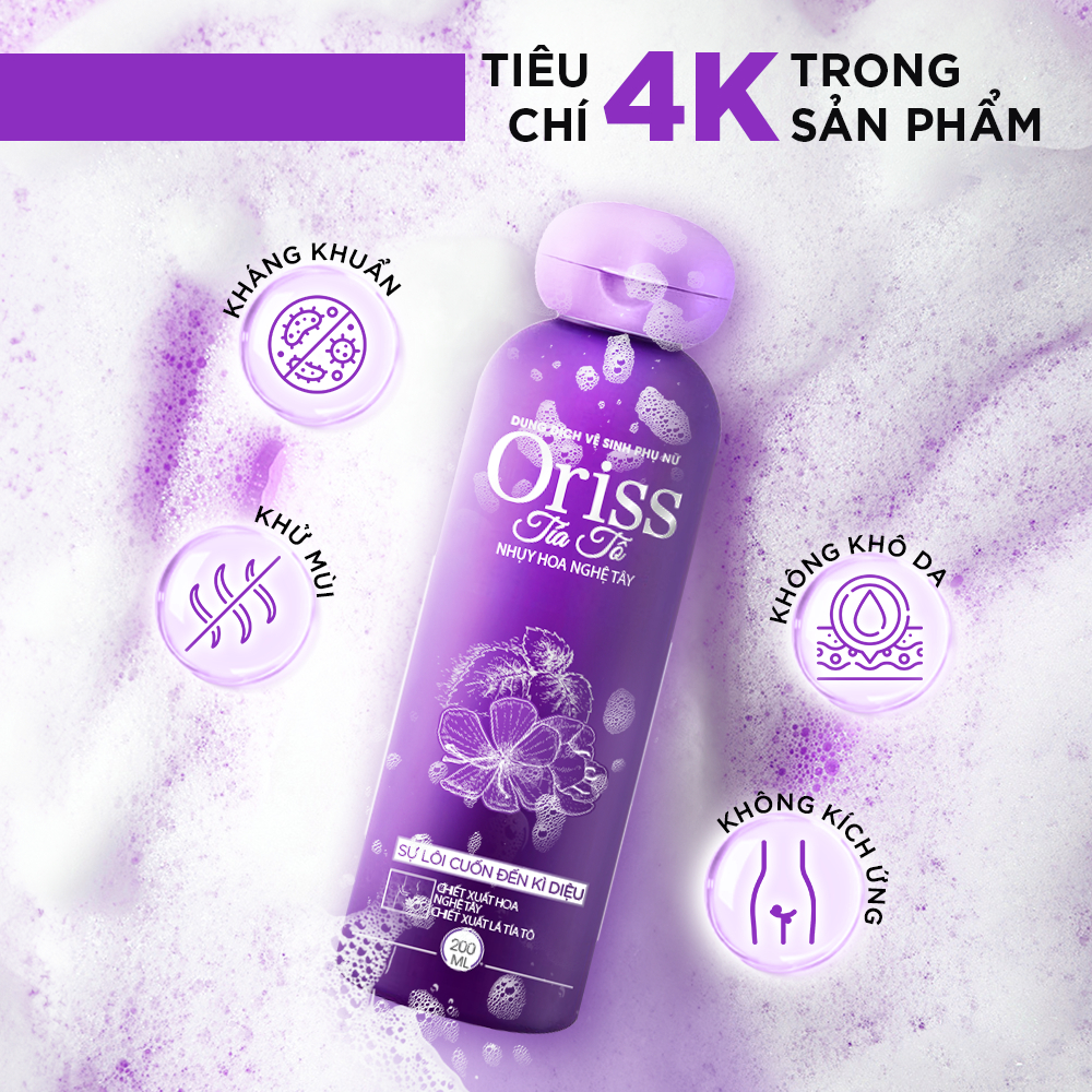 - Dùng được cho da nhạy cảm mẹ bầu và đang cho con bú THÀNH PHẦN TỰ NHIÊN HIỆU QUẢ VƯỢT TRỘI Lá Tía Tô Kháng khuẩn giảm nguy cơ bị viêm nhiễm Lô Hội Làm dịu và cấp ẩm tức thì Nhụy Hoa Nghệ Tây Giảm ngứa tăng đề kháng cho vùng da nhạy cảm Lactic Acid Cân bằng độ pH tự nhiên cho cô bé, dưỡng ẩm suốt ngày dài DUNG DỊCH VỆ SINH NỮ TÍA TÔ ORISS AN TOÀN LÀNH TÍNH PHÙ HỢP CHO: Độ tuổi dậy thì từ 13 tuổi Phụ nữ đang trong kì kinh nguyệt Phụ nữ đang bị viêm nhiễm (Khí hư, huyết trắng hay nấm ngứa...) Phụ nữ mang thai và đang cho con bú TIÊU CHÍ 4K TRONG SẢN PHẨM KHÁNG KHUẨN KHỬ MÙI KHÔNG KHÔ DA KHÔNG KÍCH ỨNG HƯỚNG DẪN SỬ DỤNG Bước 1: Làm ướt cô bé Bước 2: Cho 1 lượng vừa đủ Dung Dịch Vệ Sinh Tía Tô Nữ Oriss ra lòng bàn tay và tạo bọt Bước 3: Thoa đều bọt và massage nhẹ nhàng cô bé từ trước ra sau và không thụt rửa sâu Bước 4: Rửa lại với nước sạch sau đó thấm khô bằng khăn mềm Nước Hoa Vùng Kín Nữ Chiết Xuất Tía Tô Oriss TẠI SAO BẠN NÊN CHỌN NƯỚC HOA VÙNG KÍN NỮ ORISS?