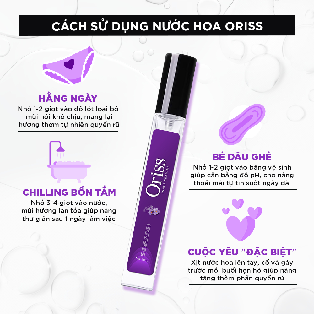 - Chính sách trả hàng hoàn tiền theo quy định đảm bảo quyền lợi cho khách hàng CÁCH SỬ DỤNG NƯỚC HOA ORISS HẰNG NGÀY Nhỏ 1-2 giọt vào đồ lót loại bỏ mùi hôi khó chịu, mang lại hương thơm tự nhiên quyến rũ BÉ DÂU GHÉ nhỏ 1-2 giọt vào băng vệ sinh giúp cân bằng độ pH, cho nàng thoải mái tự tin suốt ngày dài CHILLING BỒN TẮM Nhỏ 3-4 giọt vào nước, mùi hương lan tỏa giúp nàng thư giãn sau 1 ngày làm việc CUỘC YÊU "ĐẶC BIỆT" Xịt nước hoa lên tay, cổ và gáy trước mỗi buổi hẹn hò giúp nàng tăng thêm phần quyến rũ CHỨNG NHẬN BỘ Y TẾ AN TOÀN CHO NGƯỜI SỬ DỤNG ĐẢM BẢO CHE TÊN SẢN PHẨM 100%
