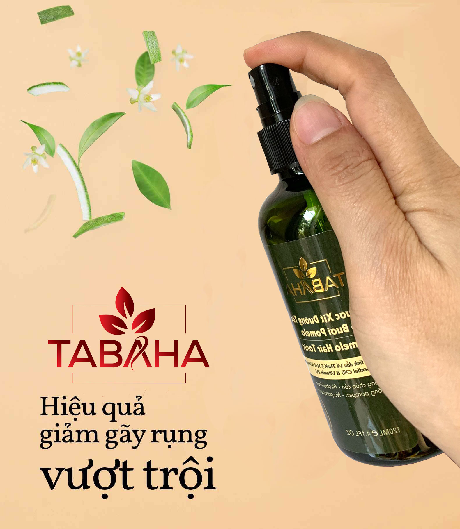 NƯỚC XỊT DƯỠNG TÓC TINH DẦU VỎ BƯỞI TABAHA 120ML   CÔNG DỤNG CỦA TINH DẦU BƯỞI TABAHA Tinh dầu bưởi Tabaha giúp nuôi dưỡng tóc từ chân tóc tới ngọn Giúp kích thích mọc tóc, dày, dài nhanh 5 đến 7 cm mỗi tháng Nuôi dưỡng da đầu, ngăn rụng, ngăn hói Giảm tóc khô xơ, phục hồi tóc chẻ ngọn và bị cháy do hóa chất Giúp tóc dày, tránh rối, mượt mà ngăn hói đầu hiệu quả sau 2-3 tuần sử dụng Tinh dầu bưởi Tabaha được chiết xuất từ tinh dầu bưởi thiên nhiên nên cực an toàn da đầu và sức khỏe Rất an toàn cho bà bầu và mẹ sau sinh nhé!! Sản phẩm 100% từ thiên nhiên   ĐỐI TƯỢNG SỬ DỤNG TINH DẦU BƯỞI TABAHA: Các bạn bị rụng tóc trung niên, rụng bẩm sinh, do stress, do sử dụng nhiều hóa chất Các mẹ các chị bầu sau sinh rụng tóc heo mảng, các cô/ chú/ bác bị rụng tóc do tuổi tác dẫn đến hói rụng tóc từng mảng. Các bạn có sợi tóc yếu và mỏng, dễ gãy rụng, tóc thưa, lộ da đầu.