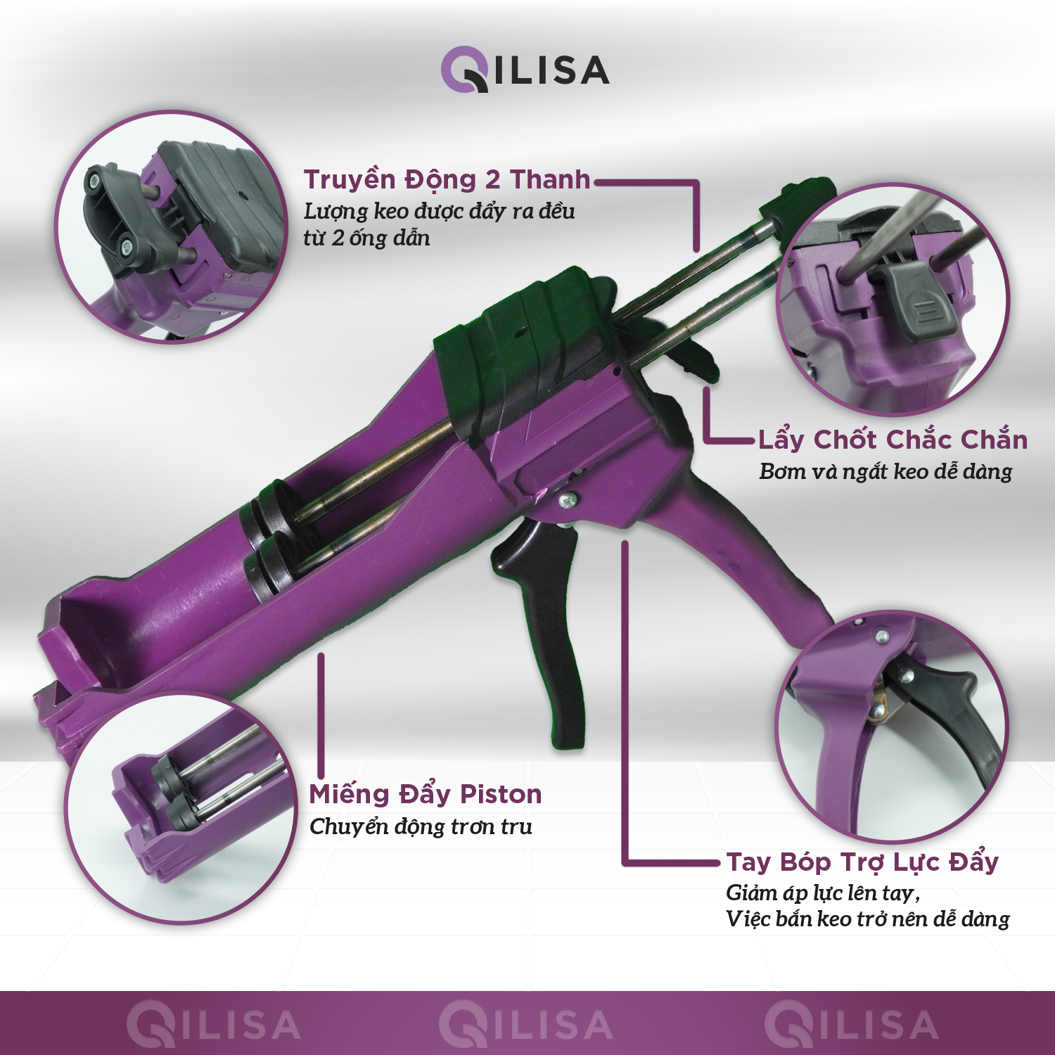 - Súng bơm keo chà ron Qilisa loại thường có thiết kế thông minh, dễ sử dụng và bền bỉ.