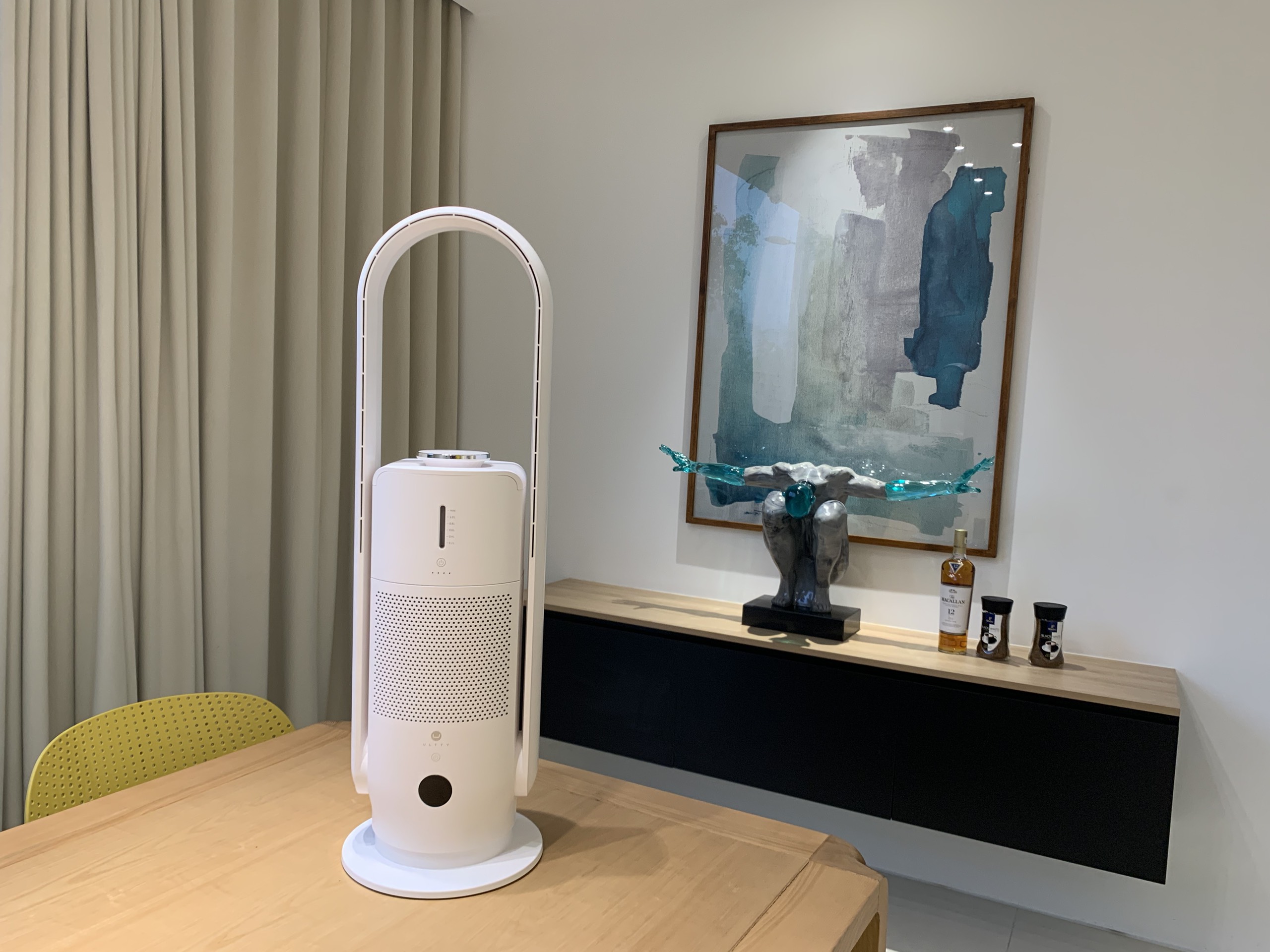 - Tăng áp tua bin, bội khí, tản nhiệt 4D, kết hợp cùng động cơ DC không chổi than mạnh mẽ, quạt lọc bù ẩm Ultty tạo ra tốc độ gió lên tới 4,5 m/s (tương đương 16,2 km/h), cao nhất trong các dòng quạt không cánh hiện nay. Gió thổi ra mềm mại tinh tế như gió tự nhiên, có thể thổi xa đến 8m, bạn sẽ không cảm nhận được sự va đập khó chịu của gió lên thân thể như quạt truyền thống