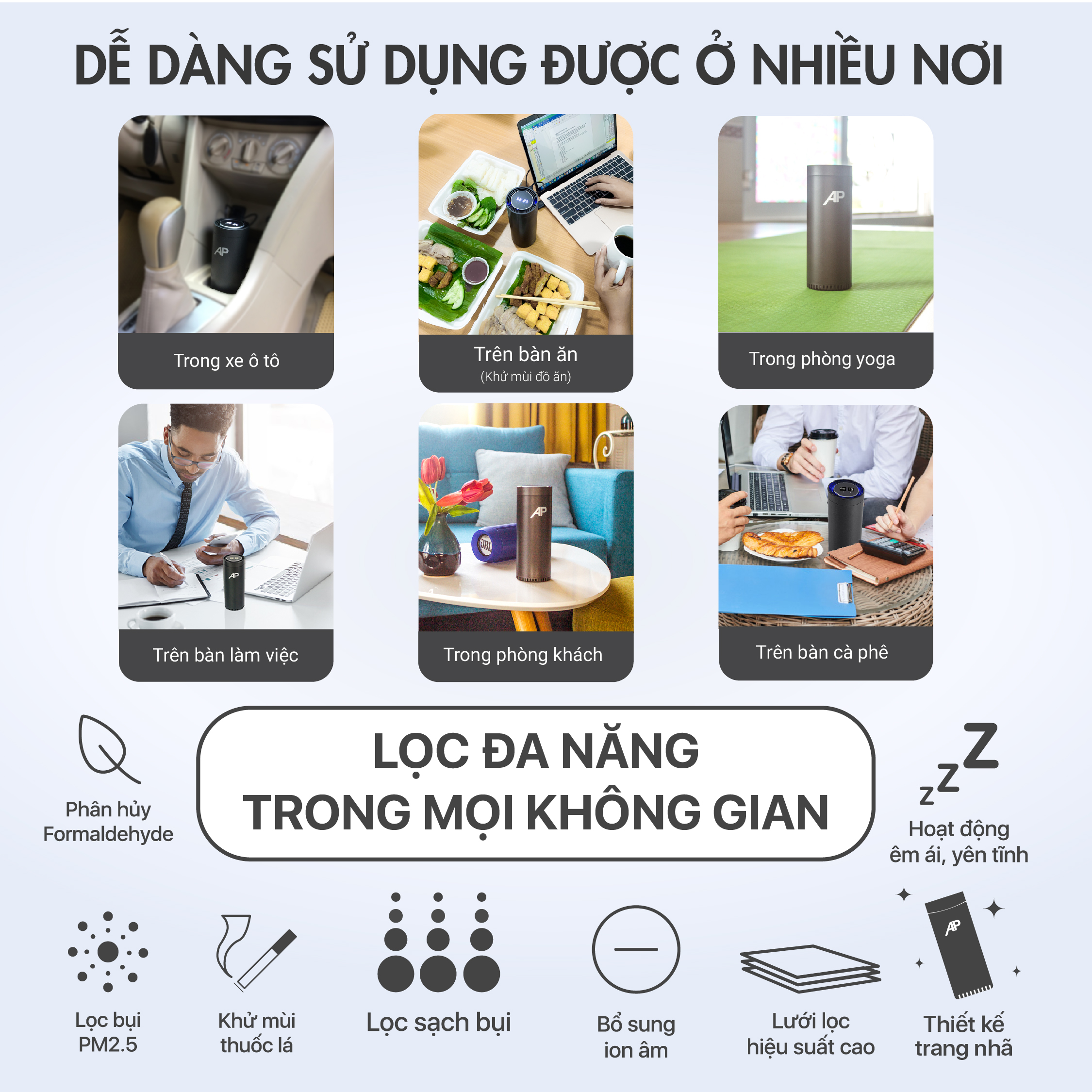 MÁY LỌC KHÔNG KHÍ CHO Ô TÔ/ XE HƠI AIR PURIFIER Máy Lọc Không Khí Ô Tô AP là máy Lọc Không Khí Và Khử Mùi mini và đa năng dành riêng cho không gian Ô Tô, Xe Hơi, Văn Phòng, Phòng Ngủ với Lõi Lọc HEPA 3 lớp. Giúp bạn đánh bay bụi mịn PM2.5 và các loại mùi khó chịu trong ô tô trong tích tắc. TẠI SAO CẦN PHẢI SỞ HỮU NGAY MÁY LỌC KHÔNG KHÍ Ô TÔ AP? Tình trạng ô nhiễm không khí tại những đô thị lớn ngày càng trầm trọng hơn trong những năm gần đây. Đối với những ai phải thường xuyên di chuyển ở trong các thành phố lớn thì đã đến lúc bạn phải trang bị một máy lọc không khí đặt trong ô tô/ xe hơi. Bạn có biết không khí trong xe ô tô luôn tích tụ nhiều bụi bẩn và mùi hôi khiến cho bạn cảm thấy mệt mỏi và nhức đầu? Vì xe ô tô là không gian kín, khói bụi khi từ bên ngoài lọt vào thường không thoát ra ngoài triệt để. Vì vậy, Máy lọc không khí mini dành cho ô tô AP giúp bạn ngăn ngừa các loại bụi bẩn độc hại tích tụ và bám trong xe gây bệnh cho con em và chính bản thân bạn. THIẾT KẾ TỐI GIẢN – VẬT LIỆU CAO CẤP: Về tổng thể, Máy lọc không khí cho ô tô AP có thiết kế cực kỳ tối giản với chỉ một nút duy nhất ở mặt trên máy khiến cho máy trở nên gọn gàng. Thân máy được thiết kế tối giản do loại bỏ các bộ phận, chi tiết không cần thiết. Kích thước máy nhỏ gọn chỉ 6.5 x 17.2 cm khiến cho máy có thể chìm vào trong không gian nội thất xe của bạn mà không gây ra sự nổi bật quá lớn. Hộp máy sang trọng, trang nhã thích hợp làm quà tặng cho những người thân yêu của bạn. Toàn bộ máy được sơn màu đen mờ mang đến ấn tượng mạnh mẽ ở ánh nhìn đầu tiên. Chính thiết kế này mang đến vẻ thể thao, năng động nhưng không kém phần sang trọng cho xe của bạn. Kích thước máy nhỏ gọn có thể lắp đặt được bất cứ nơi đâu, tại băng ghế trước hoặc băng ghế sau đều có thể mang tới hiệu quả giống nhau. CẤU TẠO ĐƠN GIẢN – HOẠT ĐỘNG MẠNH MẼ Máy lọc không khí cho ô tô AP tuy có thân hình nhỏ gọn nhờ vào sự sắp xếp hợp lý của các bộ phận cấu thành nên một máy lọc không khí hoàn chỉnh.