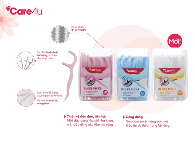 Thông số kỹ thuật: Chiều dài sản phẩm: 7,6cm (+-0,2cm), độ dài đầu chỉ: 2,3cm (+-0,2cm) Mô tả sản phẩm: Chỉ kẽ răng Care4u là sản phẩm chăm sóc răng miệng đến từ thương hiệu