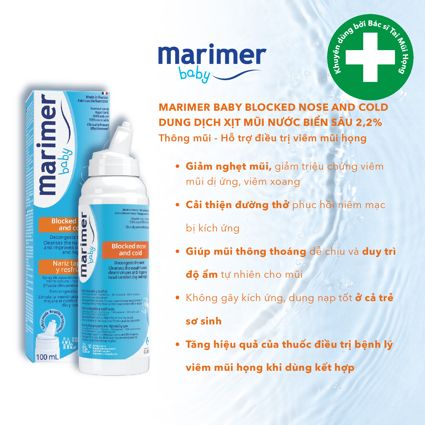 Combo nước biển sâu Marimer Baby Blocked + Gel tắm 3in1 Neutraderm Combo nước biển sâu Marimer Baby Blocked + Gel tắm 3in1 Neutraderm Gel Tắm Gội Cho Bé 3 Trong 1 NEUTRADERM Làm Sạch Dịu Nhẹ An Toàn Cho Da Bé chứa phức hợp hoạt tính Active Oligo Skin Complex chiết xuất từ nước biển IROISE không chỉ làm sạch dịu nhẹ mà còn cung cấp độ ẩm cần thiết bảo vệ làn da mỏng manh của bé. THÔNG TIN SẢN PHẨM Sữa Tắm Cho Bé 3 Trong 1 NEUTRADERM  Công dụng: - Tạo màng bảo vệ trên da bé, giúp kháng khuẩn và bảo vệ làn da mỏng manh của bé khỏi các ảnh hưởng từ môi trường như bụi bẩn, ánh nắng, kể cả da đầu - 100% Tôn trọng làn da bé - Không gây khô da sau khi tắm - Không cay mắt - Công thức dung nạp cao. Loại da: Phù hợp với mọi loại da (kể cả da nhạy cảm). 2. MARIMER BABY BLOCKED NOSE AND COLD Dung dịch xịt mũi làm thông mũi, giảm nghẹt mũi, hỗ trợ điều trị cảm cúm, viêm mũi họng Dành cho trẻ sơ sinh   THÀNH PHẦN: Nước biển ưu trương, nước tinh khiết.   CHỈ ĐỊNH:  Dành cho trẻ sơ sinh, khi có các triệu chứng bệnh lý tai mũi họng: - Thông mũi, loại bỏ dịch nhầy bẩn, virus, vi khuẩn và tác nhân dị ứng,  - Giảm các triệu chứng: nghẹt mũi, ngứa mũi, viêm mũi dị ứng, viêm xoang, cảm cúm. - Cải thiện đường thở và phục hồi niêm mạc mũi bị kích ứng.