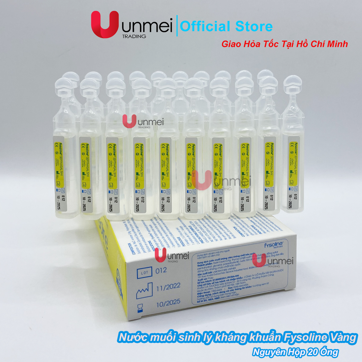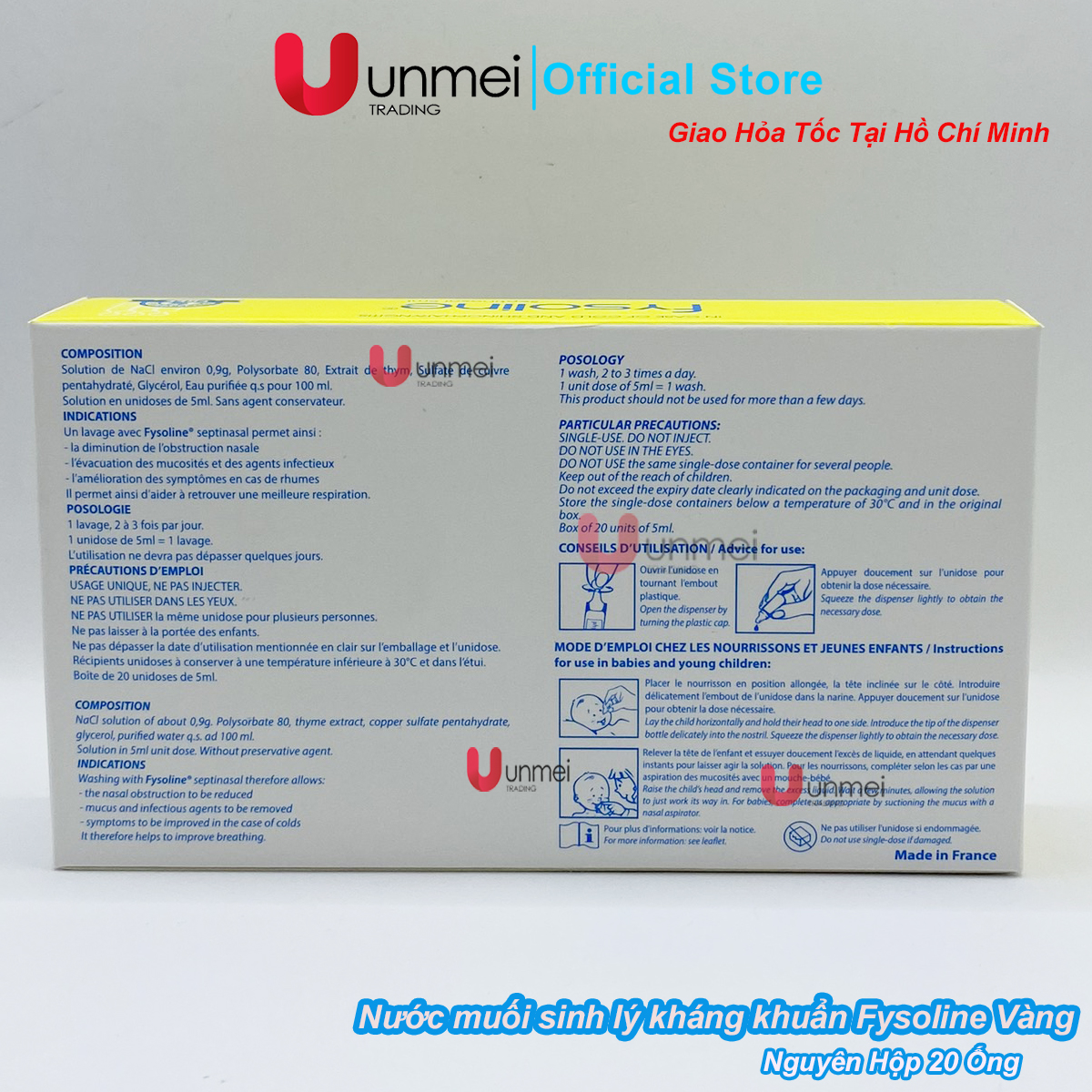 - Quy cách đóng gói: Hộp 40 ống x 5ml Nước muối sinh lý kháng khuẩn Fysoline vàng vệ sinh mũi
