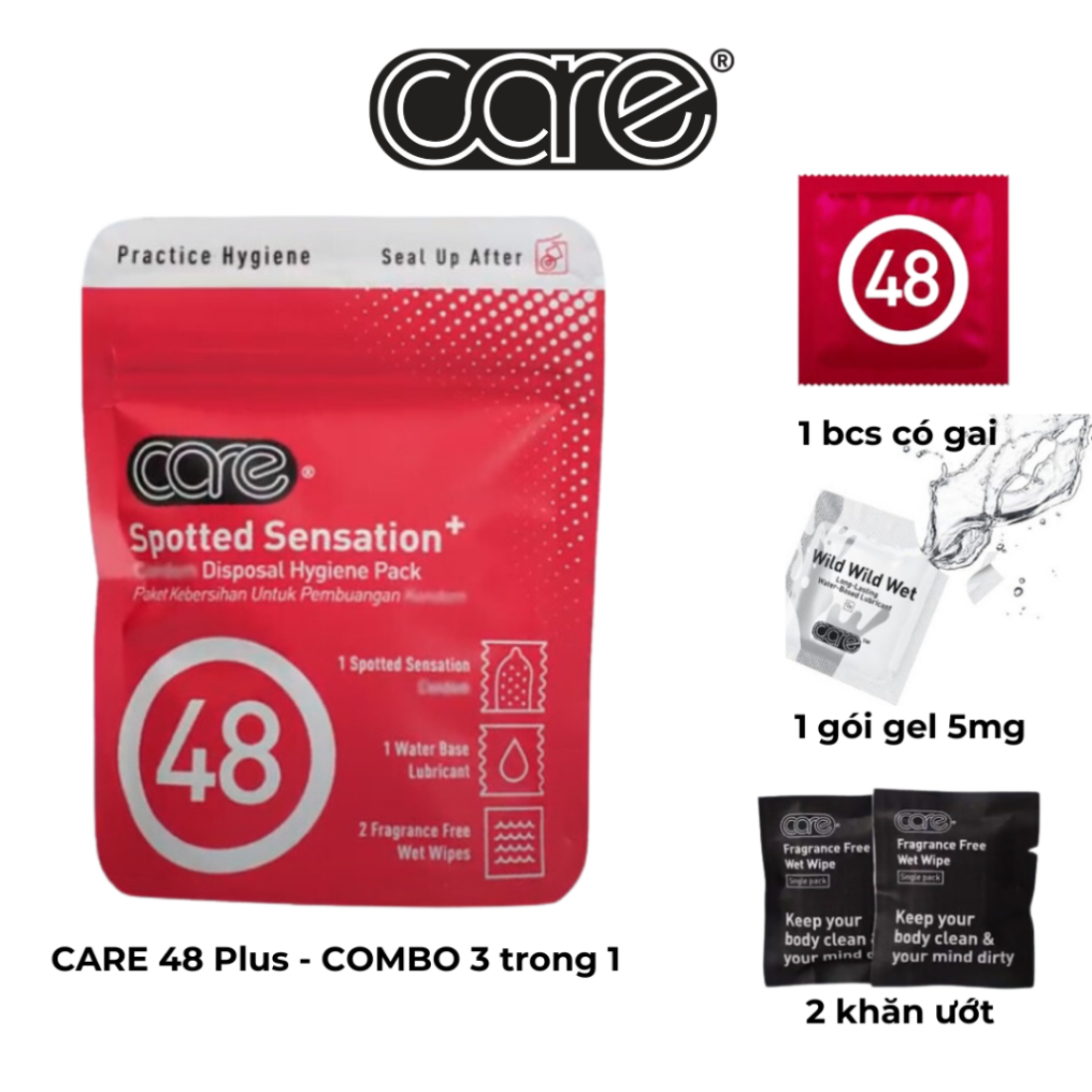 ✨Combo Quà Đi Date Bao cao su có gai, gel bôi trơn và khăn ướt vệ sinh CARE 48+