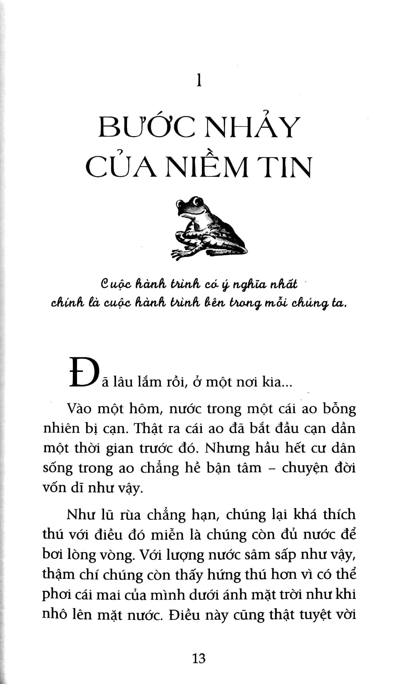 - Ping - Vượt Ao Tù Ra Biển Lớn Sau sự thành công của Ping - Vượt khỏi ao tù (tập 1), Ping – Hành trình ra biển lớn(tập 2), First News đã nhận được rất nhiều ý kiến hồi âm từ bạn đọc, đặc biệt là các bạn trẻ về nội dung và hình thức của hai cuốn sách vô cùng ý nghĩa và sâu sắc này. Điều đặc biệt mà cuốn sách mang đến cho bạn đọc thấy được là có bóng dáng m.ình trong từng trang sách, được trải nghiệm thú vị cùng với những cuộc hành trình của chú ếch Ping. Cảm nhận được điều đó bạn đọc biết trân trọng quá khứ, tiếp sinh lực cho hiện tại, từ đó định hướng tương lai một cách sâu sắc và đầy nghị lực, tạo ra bước nhảy vọt cho chính m.ình. Ping sẽ giúp bạn nhìn lại, hiểu hơn về những năng lực của bản thân và rút ra bài học để bạn bước tiếp:“hãy sống một cuộc sống đầy sôi động và say mê, thông qua sự nhận ra bản chất thật sự và những tiềm năng bất tận của bản thân”.Ngoài những lời khen của bạn đọc yêu mến, cuốn sách còn thể hiện tính giáo dục triết lý, nhân văn và lành mạnh, ẩn sâu sau mỗi câu chuyện của chú ếch tí hon đáng yêu và nghộ nghĩnh. Để tiếp nối cho sự thành công đó First News đã quyết định kết hợp hai tập “Ping - Vượt khỏi ao tù” và “Ping – Hành trình ra biển lớn” thành một cuốn. Cuốn sách Ping - Vượt Ao Tù Ra Biển Lớn mới hơn về cách trình bày giúp các bạn đọc có mạch cảm hứng liên tục, qua đó dễ dàng cảm nhận, đưa hồn vào cùng trang sách, cùng trải nghiệm với những cuộc hành trình xuyên suốt của chú ếch Ping và những người bạn. Với tài nhảy xa vô địch thiên hạ của m.ình, chú ếch Ping có đủ lý do để tự cao, tự mãn, để rồi cuối cùng lại bị chính sức ì của thói xấu ấy kìm kẹp. Nếu mạch truyện phát triển theo hướng đó, ta có thể hình dung đoạn kết sẽ là những bài học lý lẽ khô khan bàn về sự trả giá cho thói kiêu ngạo, bảo thủ, về sự hối hận muộn màng của Ping. Với những câu chuyện hấp dẫn này, Stuart Avery Gold dẫn dắt bạn đọc vào một chuyến phiêu lưu cực kỳ thú vị cùng chú ếch Ping nhằm tìm kiếm sự thay đổi, thay đổi từ chính nội tâm m.ình. “Cuộc hành trình có ý nghĩa nhất chính là cuộc hành trình bên trong mỗi chúng ta”, để có thể vững bước trên hành trình ấy, Ping cần đến sự giúp đỡ của một bác Cú thông thái. Từ đây, hai bác cháu Cú và Ếch cùng trải qua chặng đường gian nan để tôi luyện tinh thần, vượt lên thử thách nhằm tìm ra con đường minh triết – con đường SỐNG CÓ CHỦ ĐÍCH - giữa cuộc đời, nơi mỗi cá thể có thể nắm giữ vận mệnh của chính m.ình thông qua quá trình TRI NGỘ. Sau chuyến hành trình đầu tiên, vượt khỏi ao tù thành công, đến hành trình thứ hai Ping thực hiện một cuộc phiêu lưu mới – cuộc hành hương ra biển lớn với hai chú ếch trẻ là Daikon và Hodo. Lúc này đây, Ping giữ vai trò người thầy, người anh đi trước dẫn đường, hướng dẫn và truyền lại kinh nghiệm cho các đàn em. Để rồi cái đích của cuộc hành trình ấy là đại dương mênh mông, rộng lớn và hơn thế nữa là tư duy “dám nghĩ dám làm” và sự tự tin vào bản thân của hai chú ếch trẻ. Khép lại với hai cuộc hành trình thú vị của chú ếch Ping chúng ta có thể nhận thấy được rằng câu chuyện không chỉ là sự khôi hài, thông minh, tính uyên bác, trong cả việc xây dựng cốt truyện lẫn gợi mở những bài học tinh thần có giá trị. Mà cuốn sách còn gửi gắm đến độc giả trẻ thông điệp về cách sống một cuộc đời tốt nhất - cuộc đời mà từ sâu thẳm tâm hồn bạn luôn khao khát, có thể đạt được thông qua một cuộc sống biết chọn lựa và dám hành động. Có như vậy bạn mới đạt được một đời sống đầy sôi động và say mê, thông qua sự nhận ra bản chất thật sự và những tiềm năng bất tận của bản thân. Mong rằng Ping - Vượt Ao Tù Ra Biển Lớn sẽ khơi nguồn cảm hứng và giúp bạn thực hiện một cú nhảy vọt bằng những khả năng tuyệt vời của chính bản thân m.ình. Khi bạn cầm quyển sách này trên tay, chứng tỏ rằng bạn đang mở rộng lòng m.ình trước những tiềm năng vô hạn của bản thân. Hãy đọc Ping - Vượt Ao Tù Ra Biển Lớn cùng một nụ cười nhẹ nhàng, đấy là cách để bạn thẩm thấu ở mức cao nhất nguồn cảm hứng mà chú ếch Ping mang lại. Và trong khi cùng nhau khám phá ý nghĩa huyền diệu của món quà tuyệt vời này, chúng ta đừng quên một điều rằng: “Trong lúc chúng ta bỏ thời gian chờ đợi hạnh phúc, thì hạnh phúc lại ở ngay bên cạnh ta”. Sách được biên dịch từ hai cuốn The Way of Ping- Journey to the Great Ocean – A Frog in Search of a New Pond của tác giả Stuart Avery Gold (Hoa Kỳ).