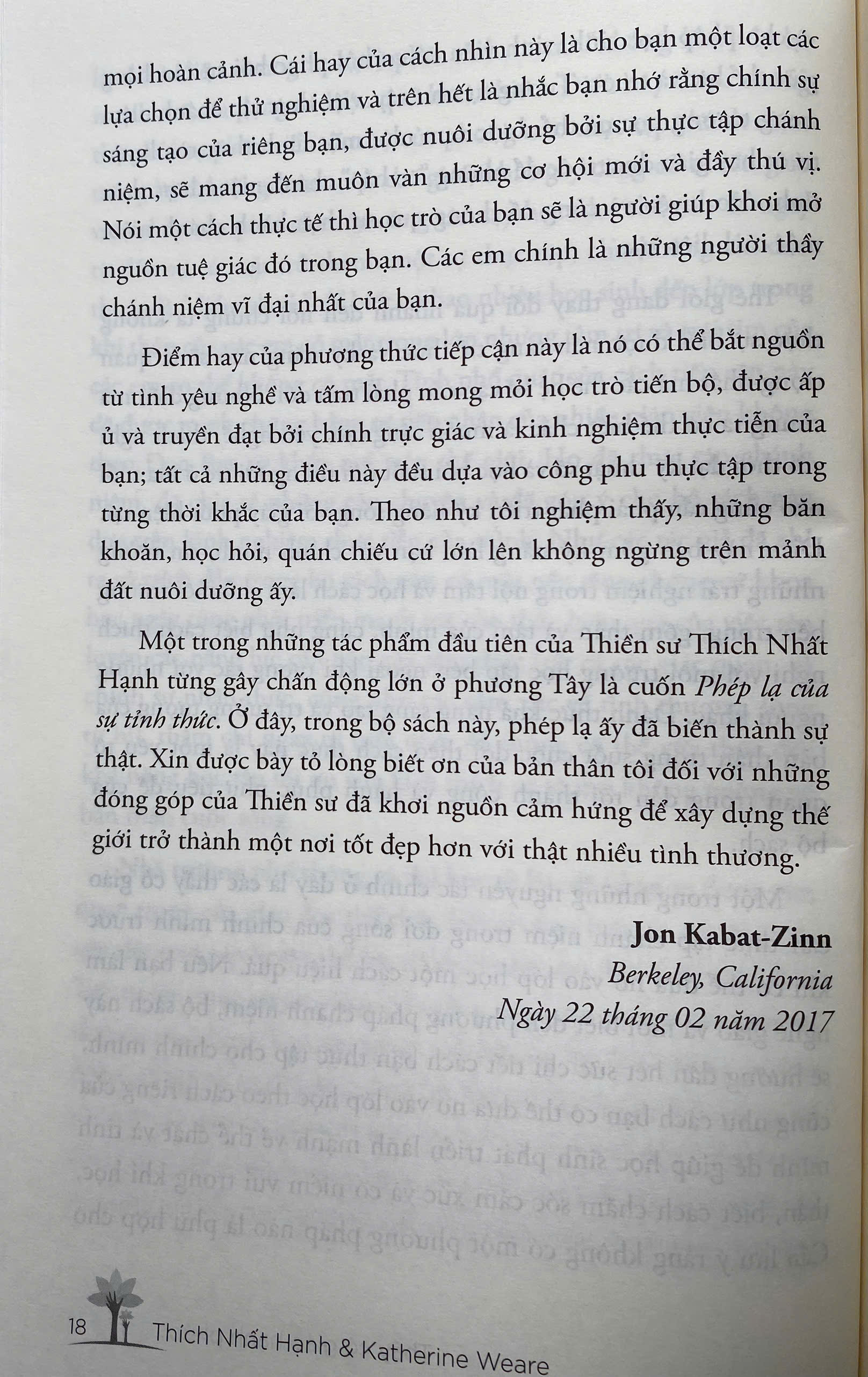 “Thầy cô giáo hạnh phúc sẽ thay đổi thế giới” - bộ sách bạn đang cầm trên tay là một món quà đặc biệt quan trọng - hay nói cách khác là một sự trao truyền - từ Thiền sư Thích Nhất Hạnh trao tặng vào giai đoạn chín muồi của một nhân cách vĩ đại. Bạn sẽ thấy rằng nó là kết tinh tình thương sâu sắc của Thiền sư đối với những người trẻ và sự mong mỏi không ngừng về một nền giáo dục bồi dưỡng tài và đức cho các thế hệ mai sau. Ở mỗi trang, bạn có thể cảm được sự tôn vinh dành cho những con người đang thực hiện sứ mệnh này, thường là âm thầm không ai biết, và khối lượng công việc khổng lồ mà họ gánh vác từng ngày nhằm phục vụ cho công cuộc kiến tạo, chuyển hóa và hàn gắn thế giới của chúng ta từ dưới lên, từ thế hệ này sang thế hệ khác - đó là những người thầy, người cô. Đây cũng đồng thời là tác phẩm được kết tinh từ sự cộng tác đầy cảm hứng với giáo sư Katherine Weare, một nhà giáo dục và cũng là một giáo viên về chánh niệm, người đã có nhiều năm nghiên cứu những tác động của thực tập chánh niệm trong môi trường học đường, và đội ngũ các cây bút cố vấn, những học trò lớn của Thiền sư từ Làng Mai. Cùng nhau họ đã thiết kế một cẩm nang thiền tập mang tính đa diện và rất dễ sử dụng để giúp các thầy cô giáo có thể đem chánh niệm vào lớp học cũng như vào đời sống của chính mình bằng nhiều hình thức. Bộ sách gồm 2 cuốn: Tập 1 “Cẩm nang hạnh phúc”, tập 2 “Đi như một dòng sông” Trong cuốn “Cẩm nang hạnh phúc” thầy Thích Nhất Hạnh và tác giả Katherine Weare sẽ chia sẻ chi tiết về chánh niệm và tỉnh thức. Bởi thế giới đang thay đổi quá nhanh đến nỗi chúng ta không thực sự biết được nền tảng tri thức và kỹ năng nào sẽ là quan trọng nhất mà các thế hệ kế cận cần phải trau dồi. Nhưng điều mà chúng ta có thể biết chắc là muốn sáng tạo, yêu nghề, thích nghi với thời đại kỹ thuật số và học hỏi suốt đời thì người trẻ ở lứa tuổi nào cũng cần phải phát triển kỹ năng sống với giây phút hiện tại. Điều này bao gồm kỹ năng làm bạn với chính mình, tin tưởng những trải nghiệm trong nội tâm và học cách làm chủ môi trường bên trong, gồm thân và tâm của mình, cũng như biết cách thích nghi với môi trường học tập bên ngoài khi tương tác với những người khác. Đánh thức khả năng sáng tạo và trí tưởng tượng của bản thân trong suốt cuộc đời theo cách thức này là một yếu tố quan trọng dẫn tới thành công và hạnh phúc như tiêu đề của  bộ sách. Một trong những nguyên tắc chính ở đây là các thầy cô giáo cần thực tập chánh niệm trong đời sống của chính mình trước khi có thể đưa nó vào lớp học một cách hiệu quả. Nếu bạn làm nghề giáo và mới biết đến phương pháp chánh niệm, bộ sách này sẽ hướng dẫn hết sức chi tiết cách bạn thực tập cho chính mình, cũng như cách bạn có thể đưa nó vào lớp học theo cách riêng của mình để giúp học sinh phát triển lành mạnh về thể chất và tinh thần, biết cách chăm sóc cảm xúc và có niềm vui trong khi học. Cần lưu ý rằng không có một phương pháp nào là phù hợp cho mọi hoàn cảnh. Cái hay của cách nhìn này là cho bạn một loạt các lựa chọn để thử nghiệm và trên hết là nhắc bạn nhớ rằng chính sự sáng tạo của riêng bạn, được nuôi dưỡng bởi sự thực tập chánh niệm, sẽ mang đến muôn vàn những cơ hội mới và đầy thú vị. Nói một cách thực tế thì học trò của bạn sẽ là người giúp khơi mở nguồn tuệ giác đó trong bạn. Các em chính là những người thầy chánh niệm vĩ đại nhất của bạn. Điểm hay của phương thức tiếp cận này là nó có thể bắt nguồn từ tình yêu nghề và tấm lòng mong mỏi học trò tiến bộ, được ấp ủ và truyền đạt bởi chính trực giác và kinh nghiệm thực tiễn của bạn; tất cả những điều này đều dựa vào công phu thực tập trong từng thời khắc của bạn. Theo như tôi nghiệm thấy, những băn khoăn, học hỏi, quán chiếu cứ lớn lên không ngừng trên mảnh đất nuôi dưỡng ấy.
