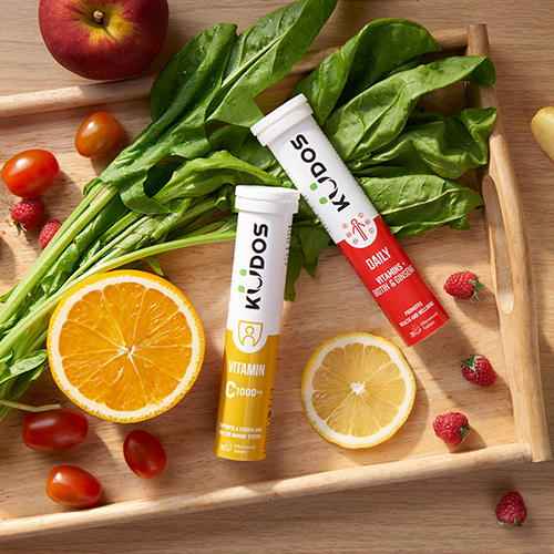 - Viên sủi KUDOS DAILY VITAMINS PLUS BIOTIN & GINSENG Bổ sung vitamin (A, C, D3, E, B1, B2, B3, B5, B6, B8, B9, B12) cho cơ thể.