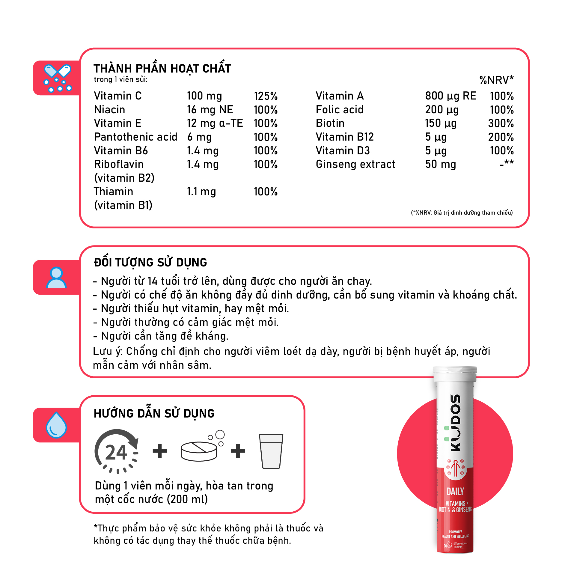 - Viên sủi KUDOS DAILY VITAMINS PLUS BIOTIN & GINSENG Trong mỗi viên sủi 4 g chứa: Vitamin C (Acid L-ascorbic) 100 mg, Chiết xuất nhân sâm 50 mg, Niacin (Nicotinamid) 16 mg NE, Vitamin E (DL-alpha-tocopheryl acetat) 12 mg α-TE, Acid pantothenic (D-pantothenat, calci) 6 mg, Vitamin B2 (Natri riboflavin 5’-phosphat) 1,4 mg, Vitamin B6 (Pyridoxin hydroclorid) 1,4 mg, Vitamin B1 (Thiamin mononitrat) 1,1 mg, Vitamin A (Retinyl acetat) 800 µg RE, Acid folic (Acid pteroymonoglutamic) 200 µg, Biotin (DBiotin) 150 µg, Vitamin D3 (Cholecalciferol) 5 µg, Vitamin B12 (Cyanocobalamin) 5 µg. Phụ liệu: Chất điều chỉnh độ acid: acid citric, natri hydro carbonat; chất độn: sorbitol; hương liệu tổng hợp (hương cam); chất tạo ngọt tổng hợp: aspartam; chất độn: maltodextrin, bột nước ép củ dền; chất tạo ngọt tổng hợp: acesulfam kali.