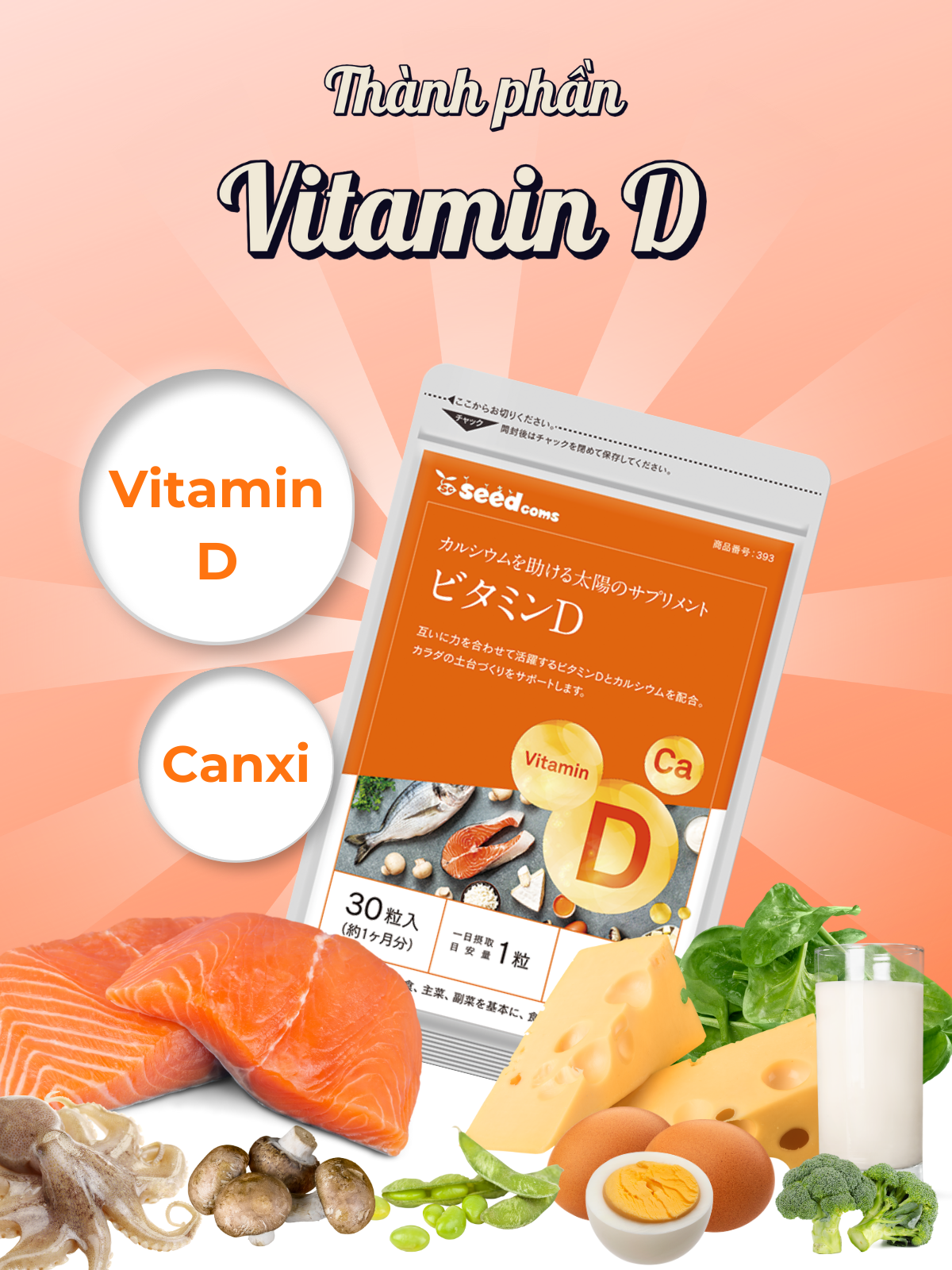 - Viên Uống Vitamin D Hỗ Trợ Tăng Cường Sức Khỏe Xương Khớp Và Hệ Miễn Dịch Seedcoms Nhật Bản Gói 30 Viên THÀNH PHẦN CỦA VIÊN UỐNG VITAMIN D: Xi-rô tinh bột mạch nha khử (sản xuất trong nước), Dextrin/cellulose tinh thể, Canxi động vật có vỏ, Calcium stearate, Silicon dioxide hạt mịn, Vitamin D QUY CÁCH & HDSD SẢN PHẨM: Số lượng viên/gói: 30 viên/gói Hạn dùng: hạn sử dụng được in trên bao bì sản phẩm. Liều lượng: Uống 1 viên/ngày