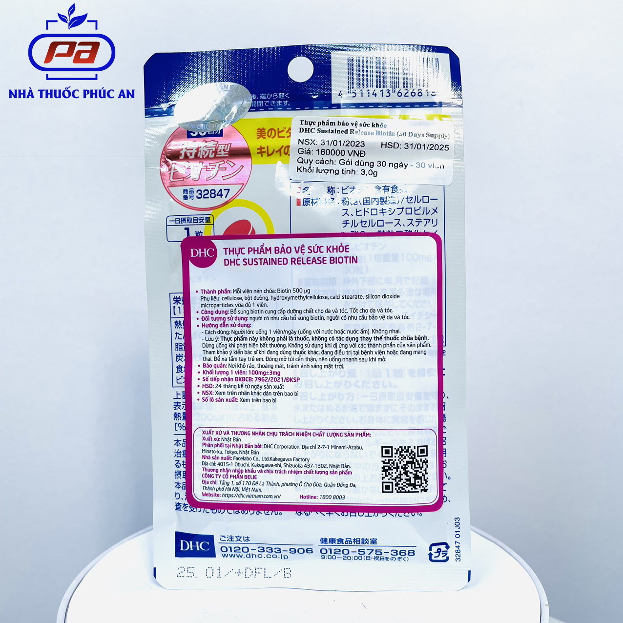 Thực Phẩm Bảo Vệ Sức Khoẻ DHC Sustained Release Biotin 30 ngày Thực phẩm này không phải là thuốc và không có tác dụng thay thế thuốc chữa bệnh. Thành phần: - Mỗi viên nến