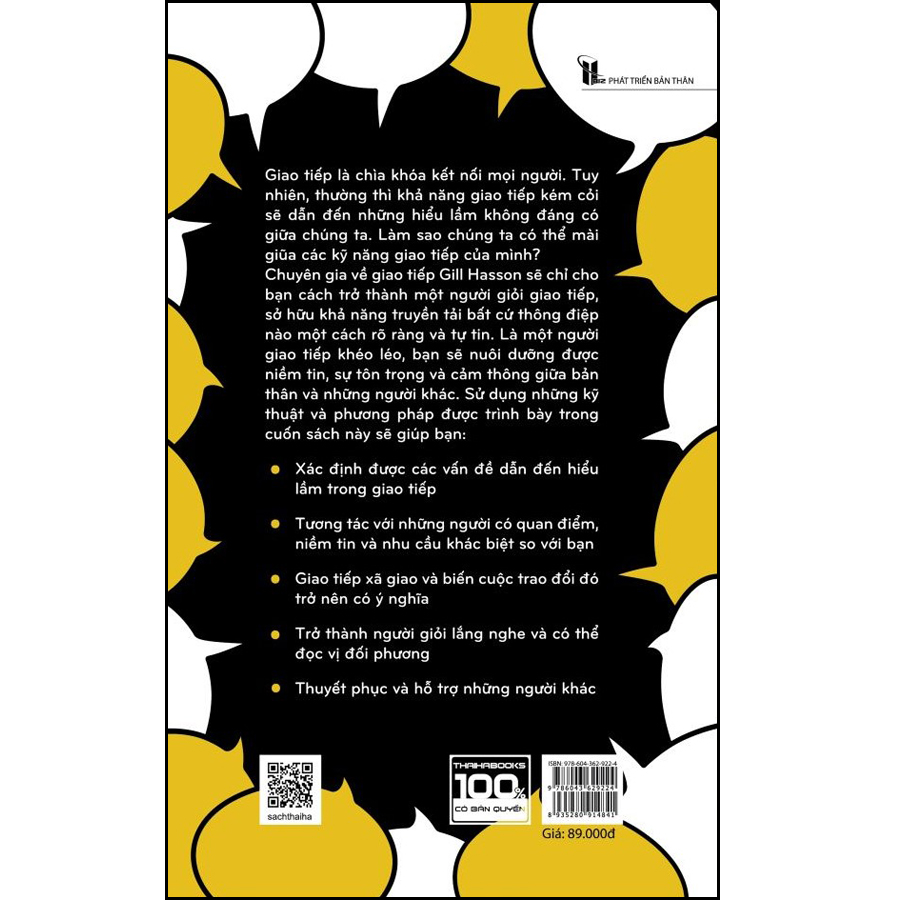 - Thuyết phục và hỗ trợ những người khác Cuốn sách này gồm hai phần và 8 chương: Phần 1 của cuốn sách bao gồm 5 chương (chương 1 – chương 5) liên quan đến các nguyên tắc để giao tiếp hiệu quả, mô tả những thứ cản trở hoạt động giao tiếp hiệu quả và chỉ cho chúng ta cách sao cho đối phương có thể dễ dàng lắng nghe và hiểu được ý của bạn. Phần 1 cũng chỉ cho chúng ta cách hiểu rõ hơn những gì người khác nói và ý của họ. • Chương 1 - Thấu hiểu giao tiếp và hiểu lầm trong giao tiếp: của cuốn sách này làm rõ một số vấn đề gây ra sự hiểu lầm; cho thấy những khác biệt văn hóa, thế hệ và cá nhân thường dẫn đến những hiểu lầm trong giao tiếp như thế nào. • Chương 2 – Biết nói gì và nói như thế nào: Miêu tả phương thức giao tiếp quyết đoán, nhấn mạnh vào sự cần thiết của sự rõ ràng và trực diện trong giao tiếp; giao tiếp sao cho đối phương dễ nghe và hiểu đúng ý bạn. • Chương 3 – Đưa vào văn bản: Giống như khi nói chuyện với ai đó, việc trình bày văn bản cũng cần hết sức dễ hiểu. Khi nói chuyện với người khác – trực tiếp hoặc qua điện thoại – bạn có thể nhận được phản hồi tức thời và nếu có hiểu lầm hiển nhiên nào, bạn có thể làm rõ ngay lúc ấy. Nhưng khi giao tiếp bằng văn bản, việc này chưa chắc đã được thực hiện, vì vậy bạn càng phải làm rõ ý của mình. Chương 3 sẽ chỉ cho bạn cách làm điều này. • Chương 4 – Trở thành người giỏi lắng nghe: Bàn về khả năng lắng nghe. Để trở thành một người lắng nghe hiệu quả, phương pháp nằm ở khả năng học hỏi và thực hành những gì được gọi là “lắng nghe chủ động”. Và điều đó đòi hỏi nỗ lực từ phía bạn nhưng nó luôn luôn đáng giá. • Chương 5 - Hiểu ý đối phương: Bạn có thể biết được rất nhiều điều nhờ những gì họ không nói – phần giao tiếp phi ngôn ngữ của họ. Những thông điệp không lời của một người có thể nhấn mạnh, hỗ trợ hoặc phản bác những gì họ nói ra. Chương 5 sẽ giúp bạn hiểu rõ hơn về lý do tại sao đối phương lại đưa ra quan điểm như vậy; làm thế nào để thấu hiểu được ý tứ của đối phương Phần 2 của cuốn sách này gồm 3 chương (chương 6 - chương 8) giúp bạn biết cách thực hành những nguyên tắc giao tiếp hiệu quả và kết nối với những người khác tốt hơn. • Chương 6 – Kết bạn: Sẽ giúp bạn học cách tự tin hơn trong các cuộc hội thoại ngắn và có thể biến cuộc hội thoại ngắn thành một cuộc trao đổi có ý nghĩa hơn trong các tình huống giao tiếp xã hội. • Chương 7 – Hỗ trợ người khác: Đưa ra một số lời khuyên rõ ràng, hợp lý về những gì cần nói và cách đáp lại một người đang gặp phải tình huống khó khăn, thách thức. • Chương 8 – Lôi kéo mọi người bằng cách thuyết phục: Thuyết phục là một kỹ năng. Có những cách thuyết phục tốt hơn và cả tệ hơn. Chương 8 sẽ tập trung vào vấn đề này. Hãy nhớ, là một người giao tiếp khéo léo, bạn sẽ nuôi dưỡng được niềm tin, sự tôn trọng và cảm thông giữa bản thân và những người khác. Về tác giả: Gill Hasson là một giáo viên, huấn luyện viên và tác giả. Bà có 20 năm kinh nghiệm làm việc trong lĩnh vực phát triển cá nhân, bao trùm các lĩnh vực về sự tự tin và lòng tự trọng, kỹ năng giao tiếp, tính quyết đoán và khả năng phục hồi. Gill tổ chức giảng dạy và đào tạo cho các tổ chức giáo dục, tình nguyện, các tổ chức kinh doanh, và khu vực công. Gill rất quan tâm và có động lực đặc biệt với việc giúp đỡ mọi người nhận ra tiềm năng của bản thân, sống một cuộc đời viên mãn!