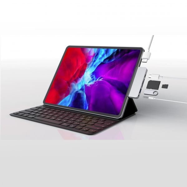 Kết nối đa dạng: Hub này cho phép kết nối trực tiếp từ cổng USB-C cho iPad Pro 2018/2019/2020 đến 6 cổng khác nhau, bao gồm cổng HDMI với độ phân giải 4K/30Hz, cổng audio 3.5mm, cổng đọc thẻ SD và micro SD, cổng USB-A 3.0 và cổng USB-C hỗ trợ Power Delivery.