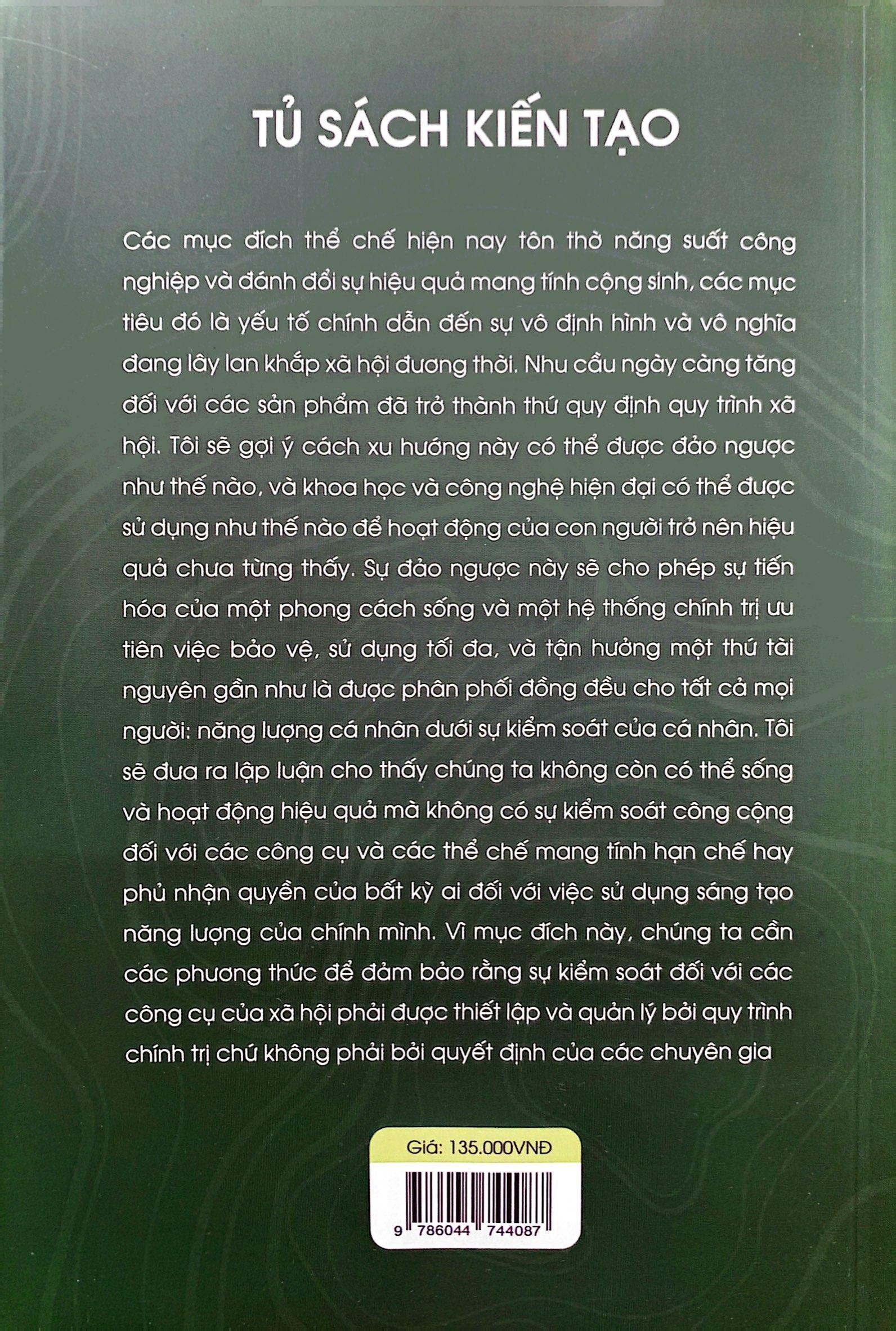 Công Cụ Cộng Sinh Trong Công cụ cộng sinh, Illich lập luận rằng các xã hội hiện đại đã trở nên quá phụ thuộc vào các hệ thống thể chế và công nghệ hạn chế tự do cá nhân và cản trở sự phát triển thực sự của con người. Ông đặt ra thuật ngữ “cộng sinh” để mô tả một xã hội mà trong đó, các cá nhân có khả năng tương tác tự do và sáng tạo với nhau, cũng như với các công cụ và công nghệ của họ, để theo đuổi mục tiêu của riêng họ và phát huy hết tiềm năng của họ. Một trong những luận điểm quan trọng của Illich là khái niệm “phản tác dụng”. Ông gợi ý rằng nhiều công nghệ và hệ thống, khi chúng vượt quá một ngưỡng nhất định, sẽ bắt đầu gây hại nhiều hơn là có lợi. Illich đề xuất tư duy lại triệt để về giáo dục, ủng hộ các mạng lưới học tập trao quyền cho các cá nhân kiểm soát quá trình học tập của chính họ. Ông nhấn mạnh tầm quan trọng của việc học tập trong suốt cuộc đời và thúc đẩy ý tưởng rằng giáo dục nên là một nỗ lực tự do và tự định hướng. Về lĩnh vực công nghệ, Illich ủng hộ các công cụ có thể truy cập, tùy chỉnh và trao quyền. Ông khuyến khích sự phát triển của các công nghệ thúc đẩy tính cộng sinh, cho phép các cá nhân sử dụng chúng theo những cách nâng cao quyền tự quyết cá nhân của họ và thúc đẩy xây dựng cộng đồng. Mục lục: Lời cảm ơn Giới thiệu Chương 1: Hai bước ngoặt Chương 2: Tái thiết kế cộng sinh Chương 3: Cán cân đa chiều