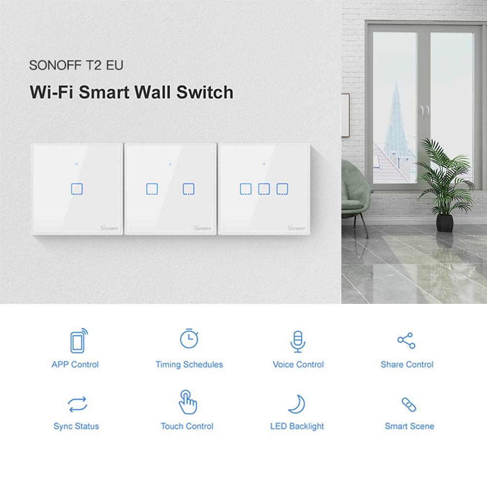 The WiFi smart switch can be controlled remotely using your phone, and devices connected with switches can work independently. Sonoff T2 supports 433MHz remote controller (not included) to control. Works with Amazon Alexa and Google Assistant which let you turn on or off your appliances with a voice command, perfect for those need to handle much housework simultaneously. Features sensitive touch buttons that are attached on the simple and stylish switches to ensure a modern and nice decoration on any wall surface. A slight tap for easier control. Set a time for devices and the switches will help you turn on or off them automatically. Tailor smart scene for your appliances. simply set an event to happen to trigger one SONOFF device or groups of devices with a tap on your phone. Compatible with IFTTT function, the switch can communicate with a slew of devices and services, to trigger them on or off.